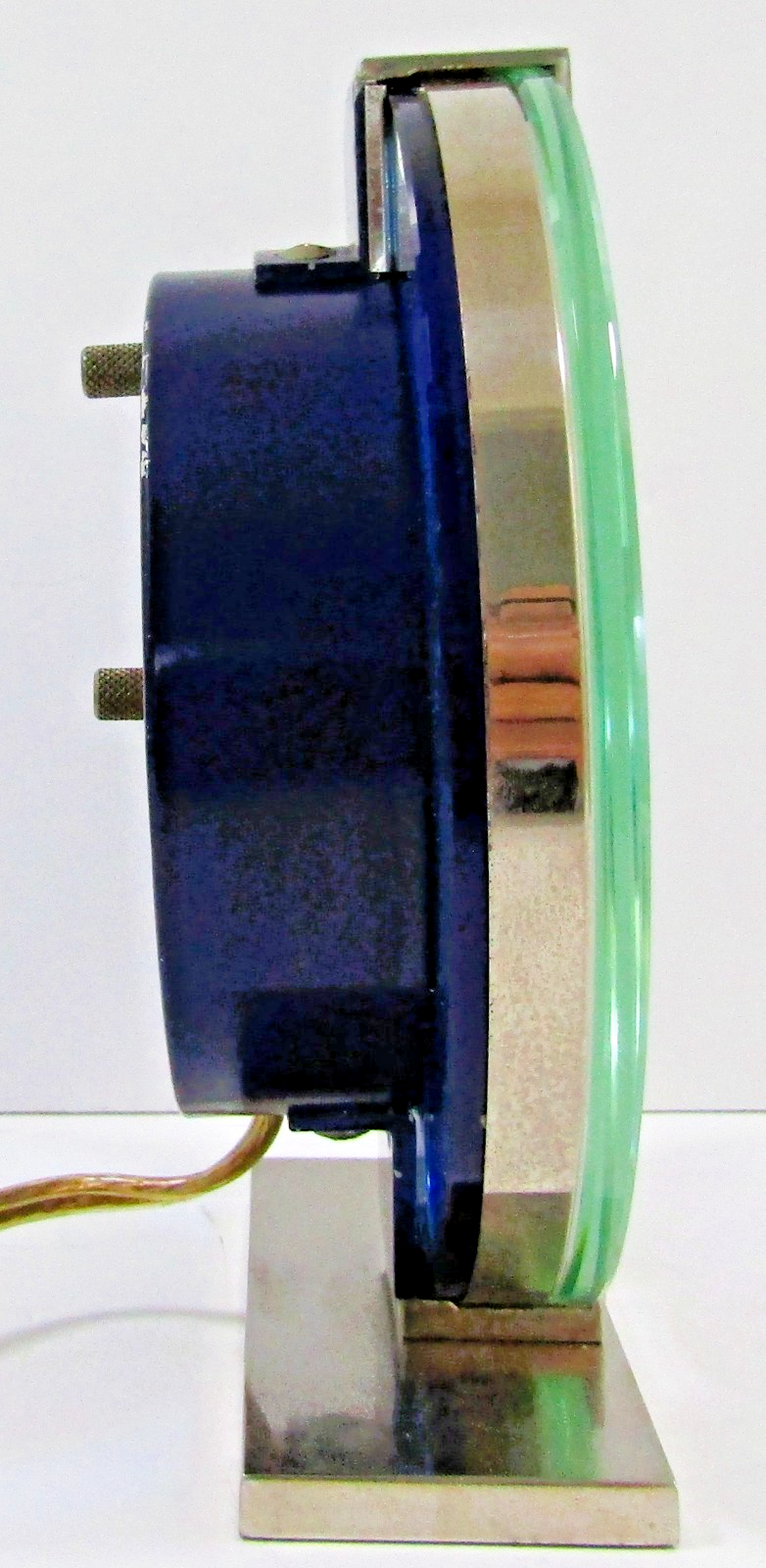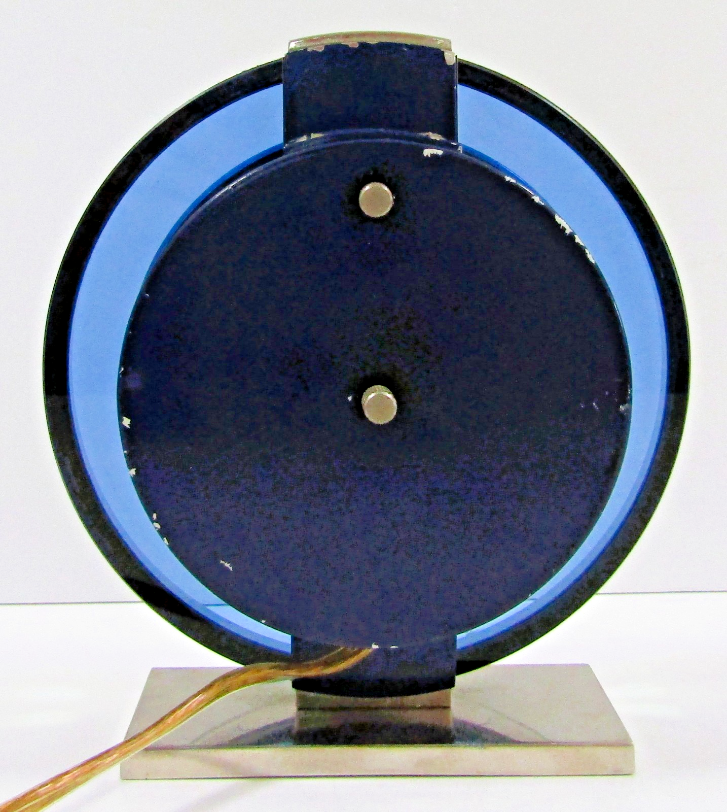 The 1930s Rare Westclox Andover Electric Clock is a unique and desirable collectible for enthusiasts of vintage timepieces. Featuring a classic round shape and elegant Art Deco style, this desk clock showcases a rare quartz movement and a striking blue color with Arabic numerals. Crafted in the United States during the early 20th century, this original piece is sure to add a touch of nostalgia and sophistication to any room with its chrome frame and plug-in electric power source. The clock movement keeps accurate time. The face and dial are very clean. The chrome is shiny. The cord and plug are in good condition. Model #221.