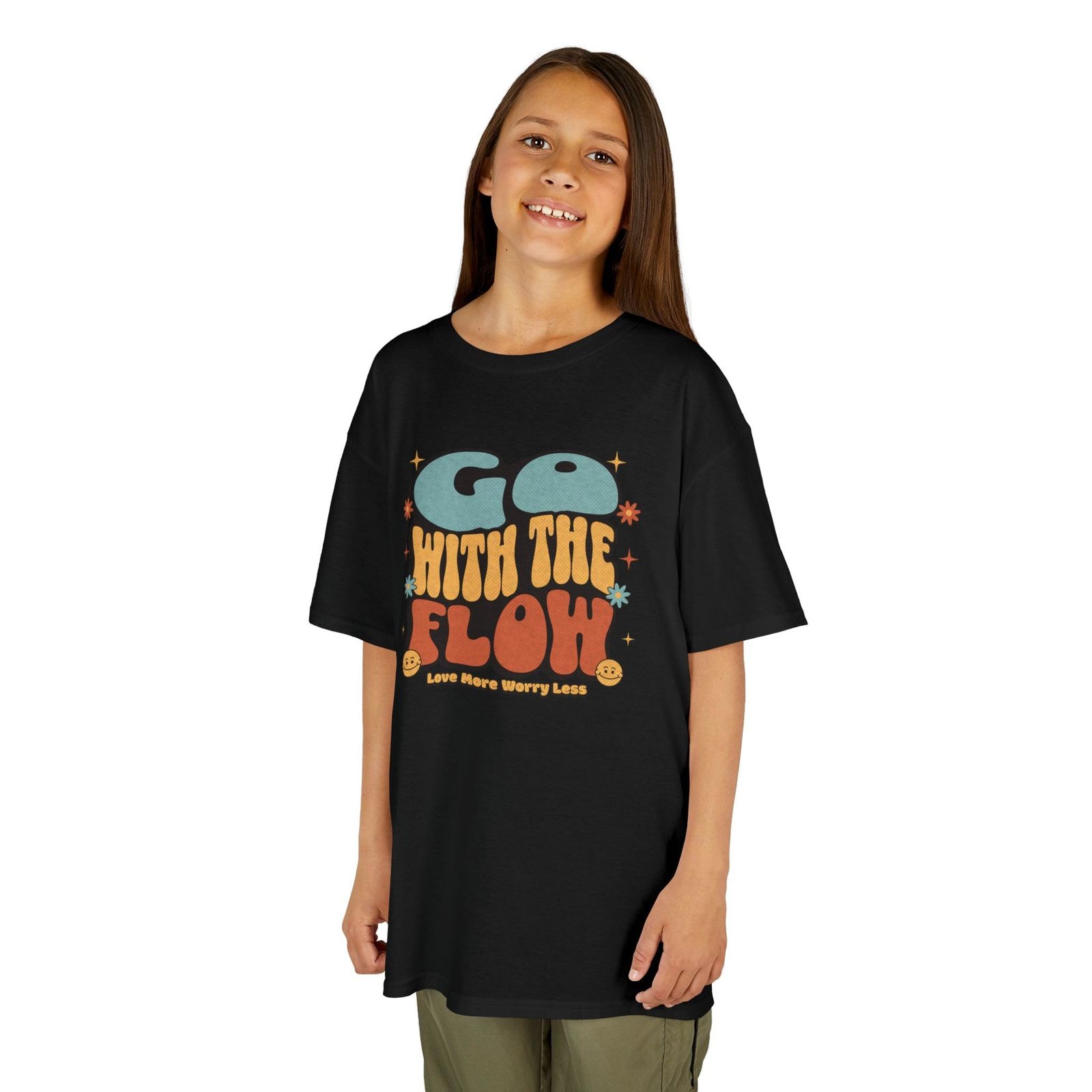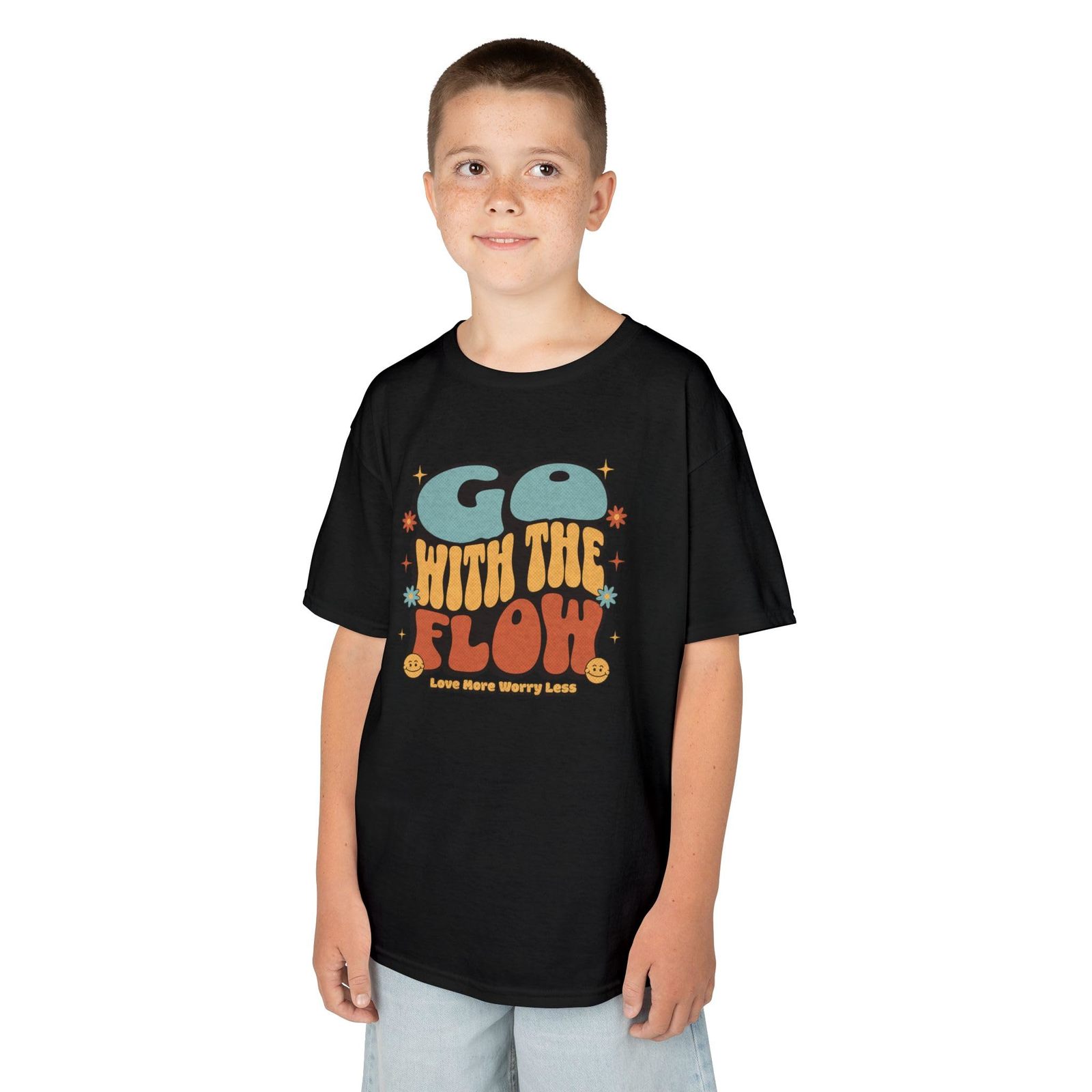 Introducing our vibrant Kids Heavy Cotton Tee, the perfect canvas for young adventurers! Featuring a playful design that encourages a carefree spirit, this tee radiates positivity with its cheerful mantra: "Go with the Flow." Made for comfort and style, it?s the go-to choice for kids who love to express themselves. Whether it's a casual playdate, a birthday celebration, or a holiday gathering, this tee fits seamlessly into any occasion. Ideal for children aged 4-12, it can be a thoughtful gift for back-to-school or festive celebrations, promoting a laid-back vibe wherever they wear it. Product features - Knit in one piece without side seams to reduce waste and enhance aesthetics. - Elastic ribbed knit collar retains shape for long-lasting wear. - Shoulder tape stabilizes the garment, preventing stretching and ensuring durability. - Smooth, tear-away neck labels provide comfort without scratching. - Made from 100% ethically sourced US cotton for a soft, breathable feel. Care instructions - Machine wash: warm (max 40C or 105F) - Non-chlorine: bleach as needed - Tumble dry: medium heat - Iron, steam or dry: low heat - Do not dry clean