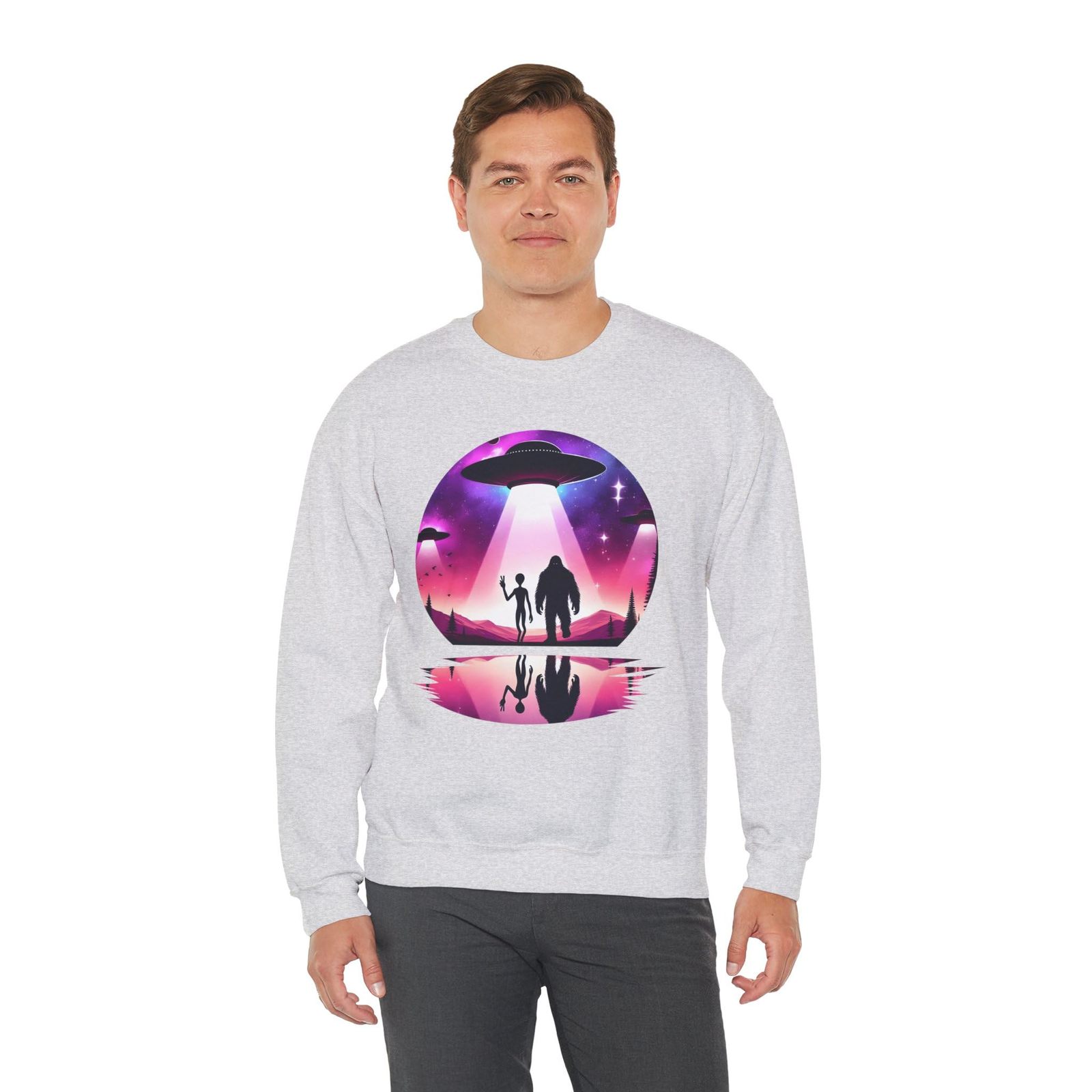 Cosmic Adventure Crewneck Sweatshirt Unisex Space Theme, UFO Art, Bigfoot Desi