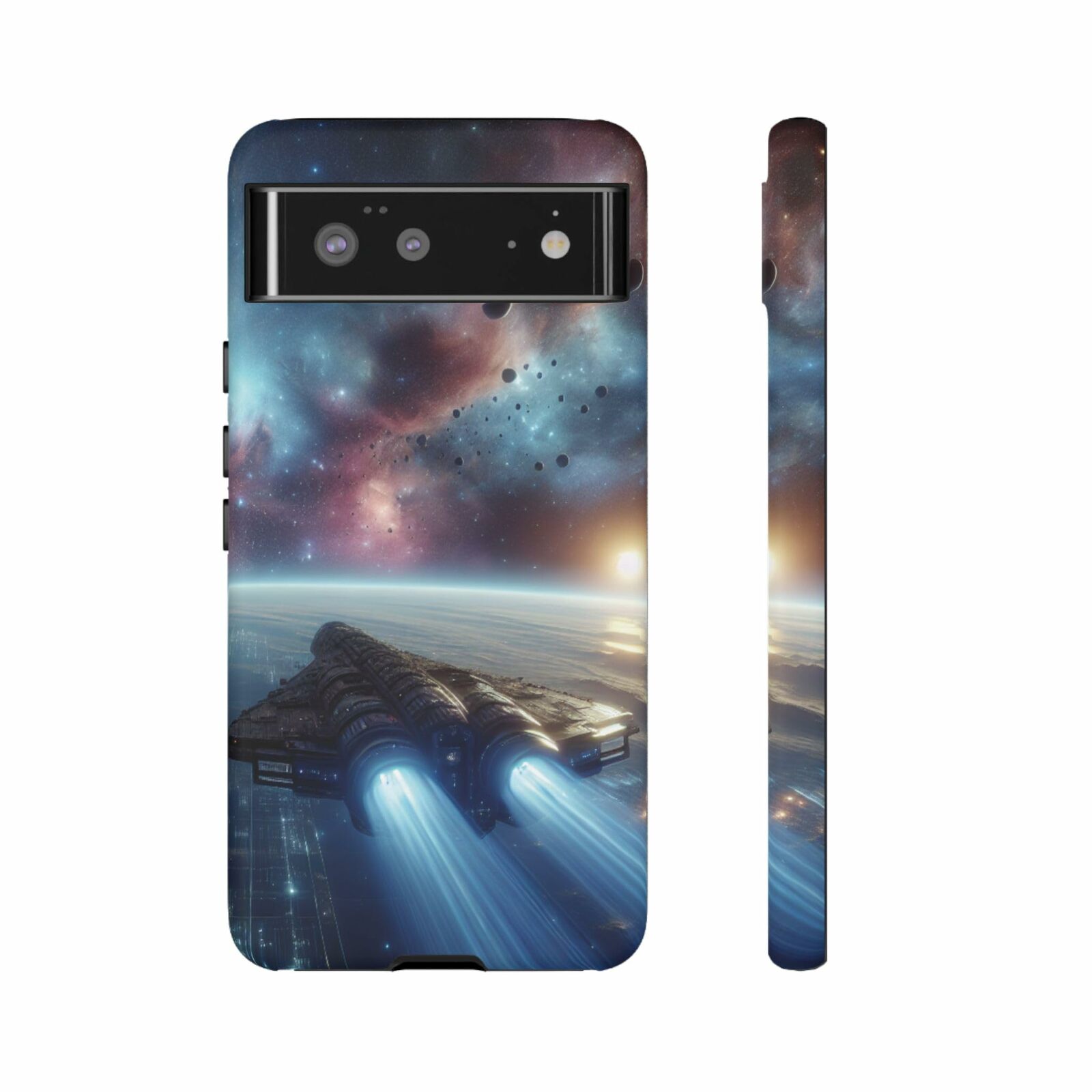 Spaceship Traveling phone case cover featuring a space art design, perfect for iPhone and Galaxy Plus phone accessories. Provides excellent shock absorption and impact resistance, with a premium finish and clear ports for connectivity. Ideal for adults who love space-themed gifts and celebrations like birthdays or holidays. Care instructions - Clean with a soft damp cotton or microfiber cloth (add a drop of dish soap if needed).