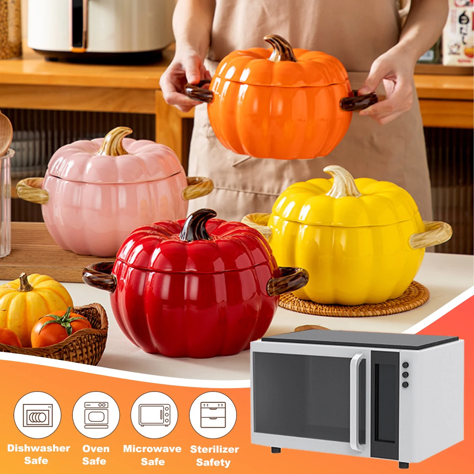 Unique Cute Pumpkin Design: This cute pumpkin bowl with lid accurately imitates the shape of a pumpkin, unique and exquisite appearance is suitable for those who loves new things for their table. Whimsy dinnerware makes your food looks more appetizer. It is not only a practical kitchen cookware dinnerware, but also a unique pumpkin decor suitable for Home kitchen decor, dining table decor, Halloween decor, Thanksgiving decor, fall decor. Multifunctional Kitchen Cookware: Pumpkin pot size 10.3(L)*10.3(W)*6.1(H) inch, Capacity: 1.7 Quart. Perfectly sized pumpkin dutch oven for multiple uses, can be used in the oven or microwave to bake or make desserts, or to make other delicious dishes, stews, and to hold various fruits, pickles, olives, nuts, dipping sauces and soft cheeses, etc. Can also be used as a Halloween candy bowl. Ceramic Bowl with Lid Handle: Our ceramic pumpkin saucepan made from high quality ceramics material, which is durable and heat-resistant so that it. Each soup bowl is designed with handles for easier removal from the oven or microwave. It is also easier to move when it holds hot food. The lid keeps food warm longer and stay juicy. Serving hot soup in this ceramic bowl with lid preserves the flavor. Nonstick Easy Cleaning: This mini dutch oven pot with lid was fired at high temperature with a special process, nonstick and smooth glaze resists sticking or scratching, easy to clean, you can rinse it in warm water with soap to clean up or just put it in dishwasher (except the lid). Ceramic pumpkin bowl safe in microwave, oven, dishwasher and freezer. Festive Table Decor Gift: Embrace the festive spirit with our delightful pumpkin baking dishes with lid, perfect for themed occasions like Halloween, Thanksgiving, and Fall/Autumn events. pumpkin casserole dish with lid is also an ideal Halloween gift, Thanksgiving gift, birthday gift, Christmas gift, fall gift, housewarming gift.