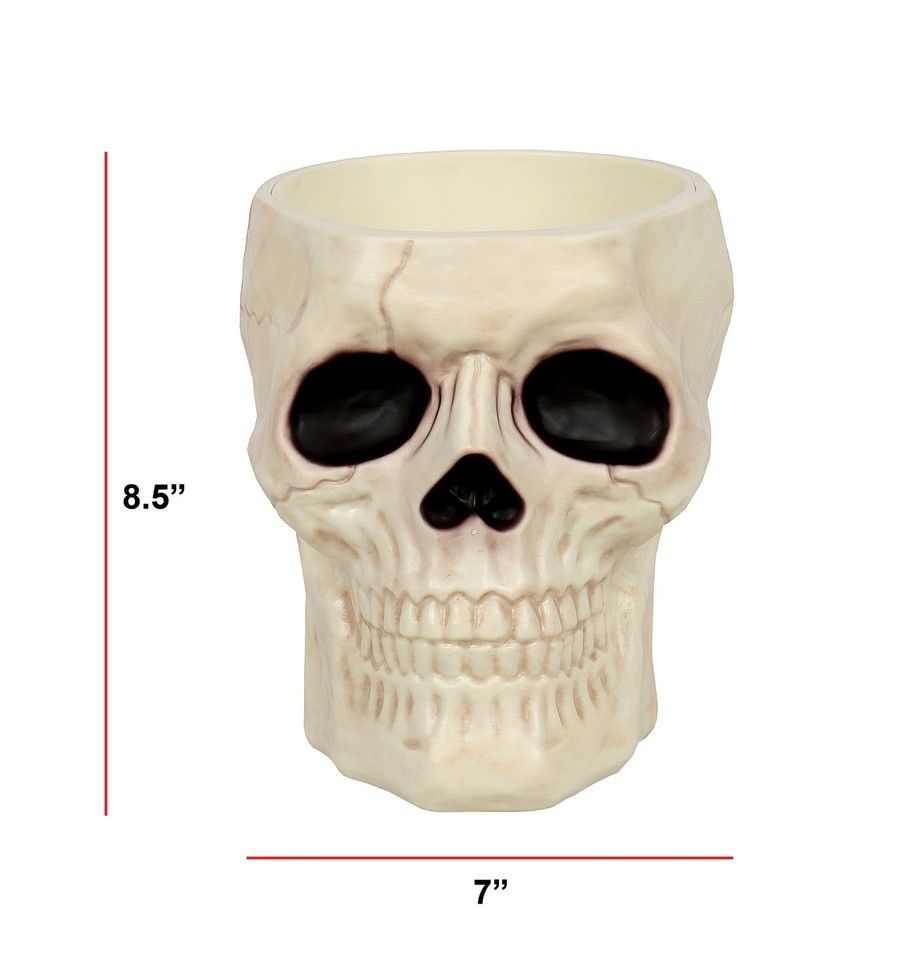 Molded plastic candy bowl holder Molded and painted skull details Total prop size is 9" H x 8" W x 9" D Inner candy bowl is 7" L x 6" W x 4" D