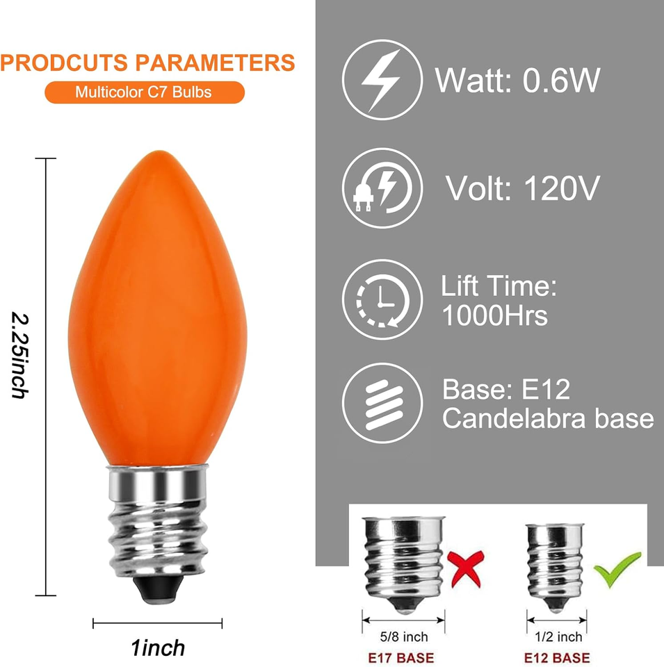 ? Fits Socket: Orange christmas replacement lights bulbs fit in C7/E12 candelabra base, C7 led outdoor bulbs perfer for all E12 base outdoor string lights, window candle lamp, chandeliers, night light, Christmas tree halloween decoration lights