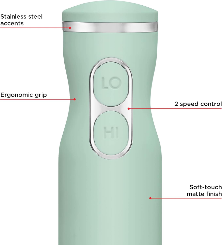 BETTER HOME BLENDING: The high-speed, quiet 300-watt immersion blender transform food and crushes ice at the push of a button. Enjoy an easy blending process with 2 one-touch speeds: HI LO. The sleek, ergonomic easy-grip handheld design with soft-touch finish was built to put pureeing power in the palm of your hand, for even results in seconds.