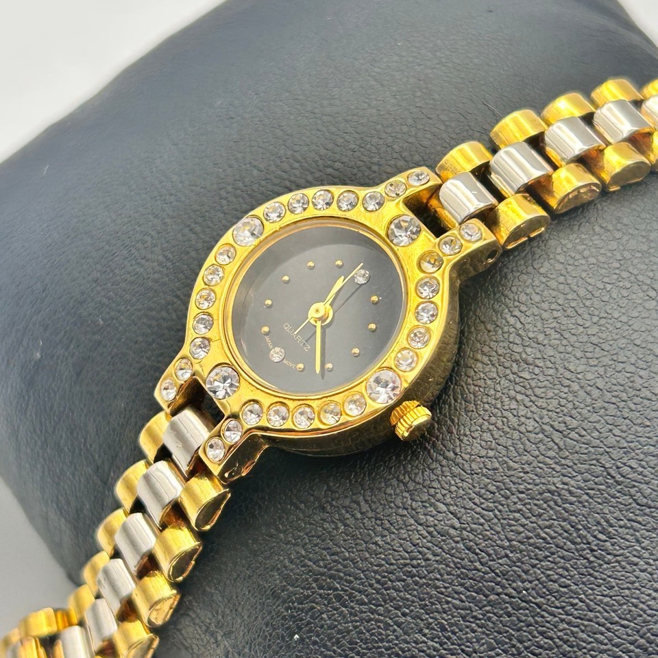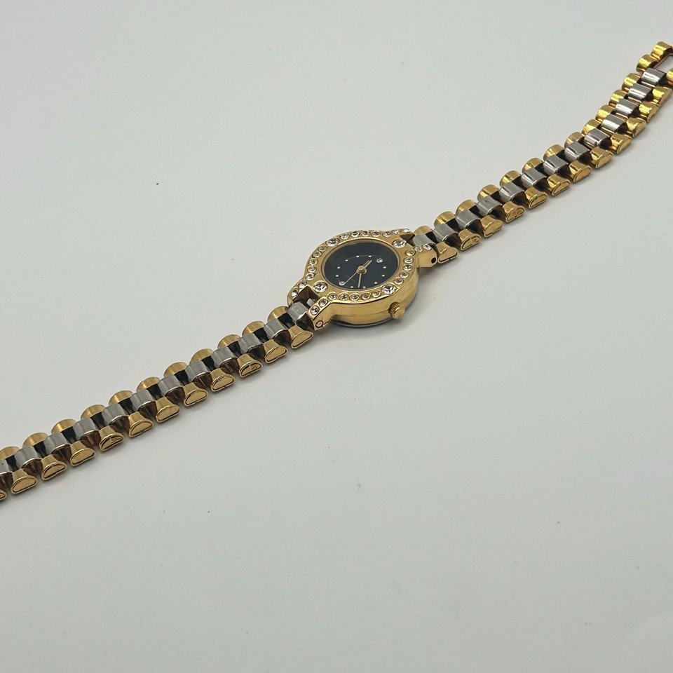 This beautiful women's quartz watch features a stunning combination of gold and silver tones, accented with sparkling crystals. The watch is made with durable stainless steel and has a brand new battery installed, so it's ready to wear and enjoy.