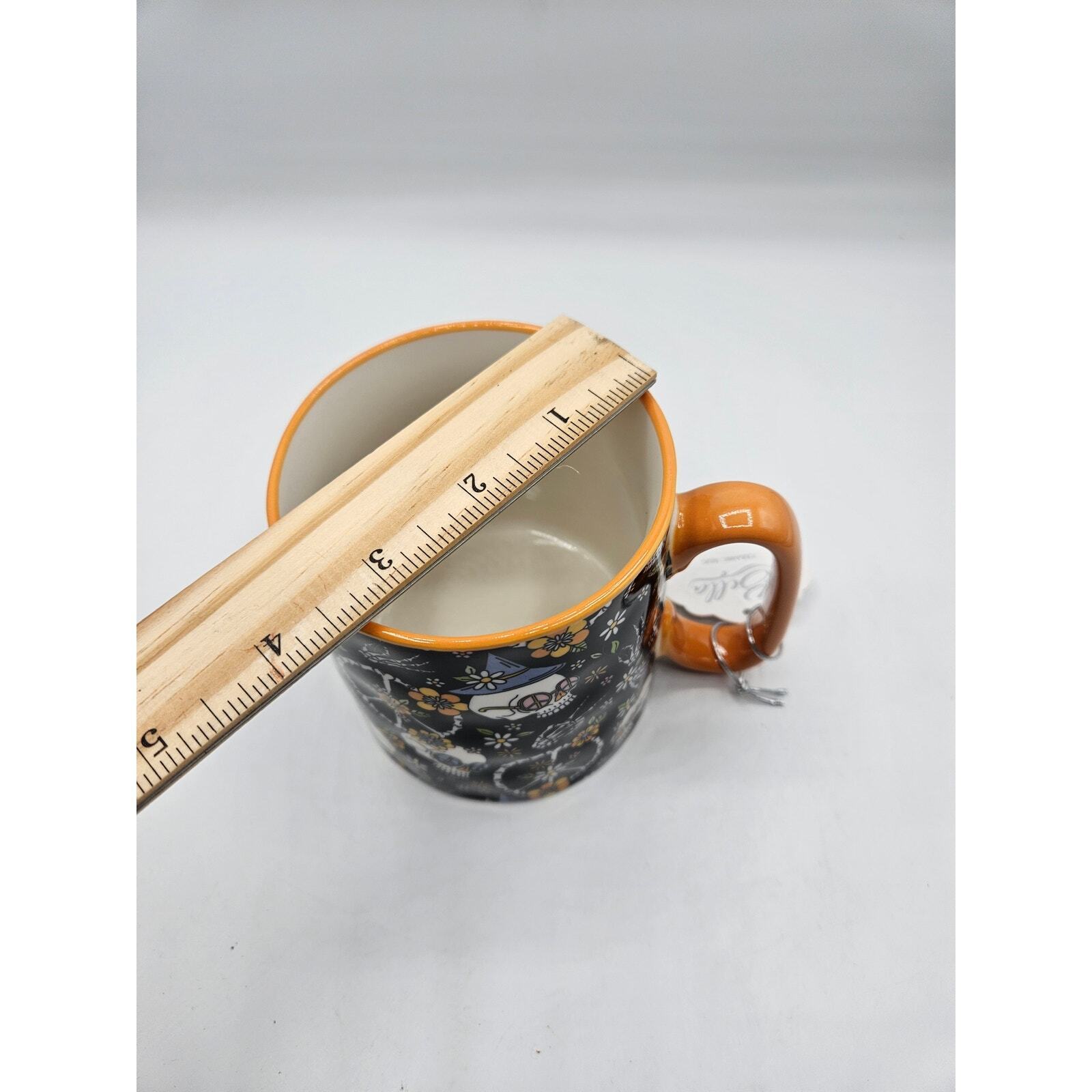 10 Strawberry Street Halloween 18 oz Coffee Soup Mug Skulls Peace Orange NEW