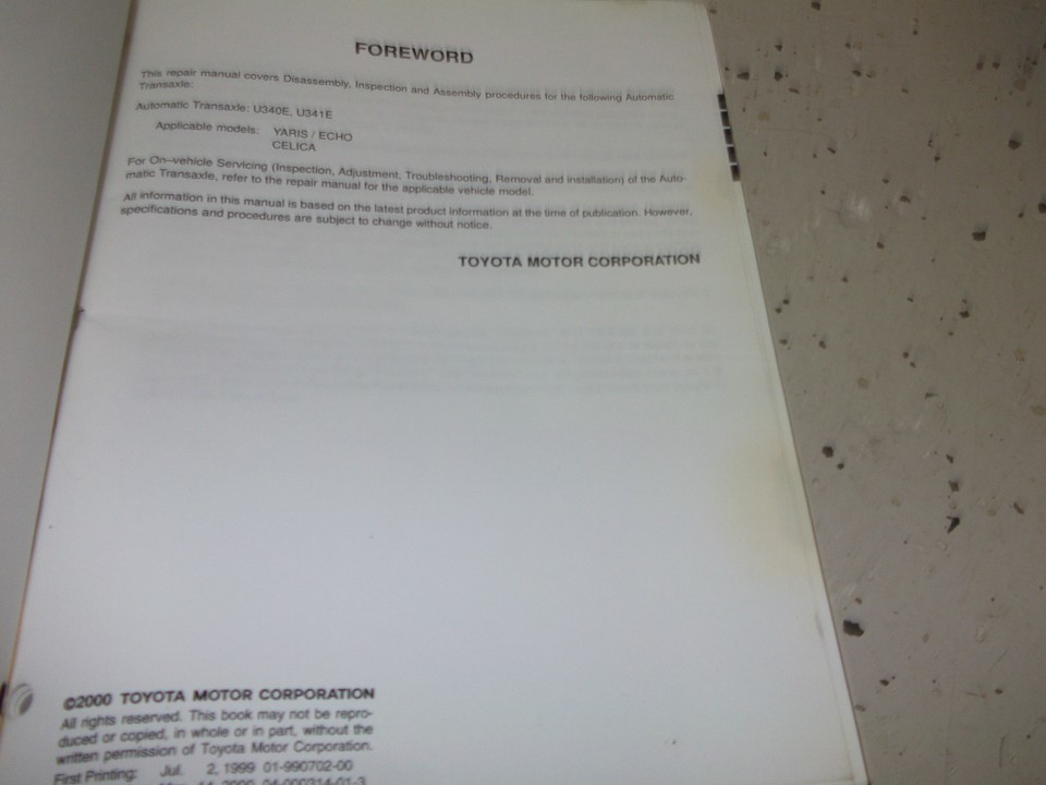 2002 Toyota Echo Automatique Transaxle Service Atelier Réparation Manuel U340E