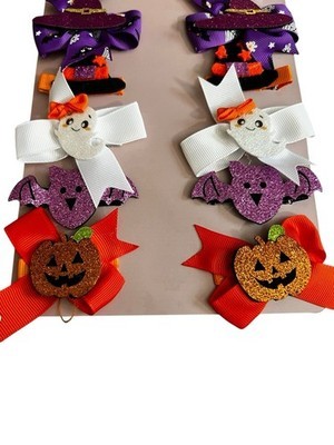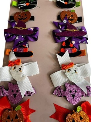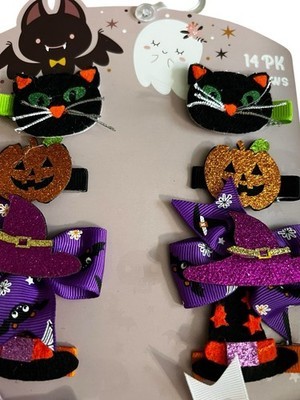 Adorable Halloween-themed hair bow set ? 14 pieces total! Each bow features festive designs including glittery pumpkins, bats, ghosts, black cats, and witch hats. Great for parties, costumes, or spooky school spirit!