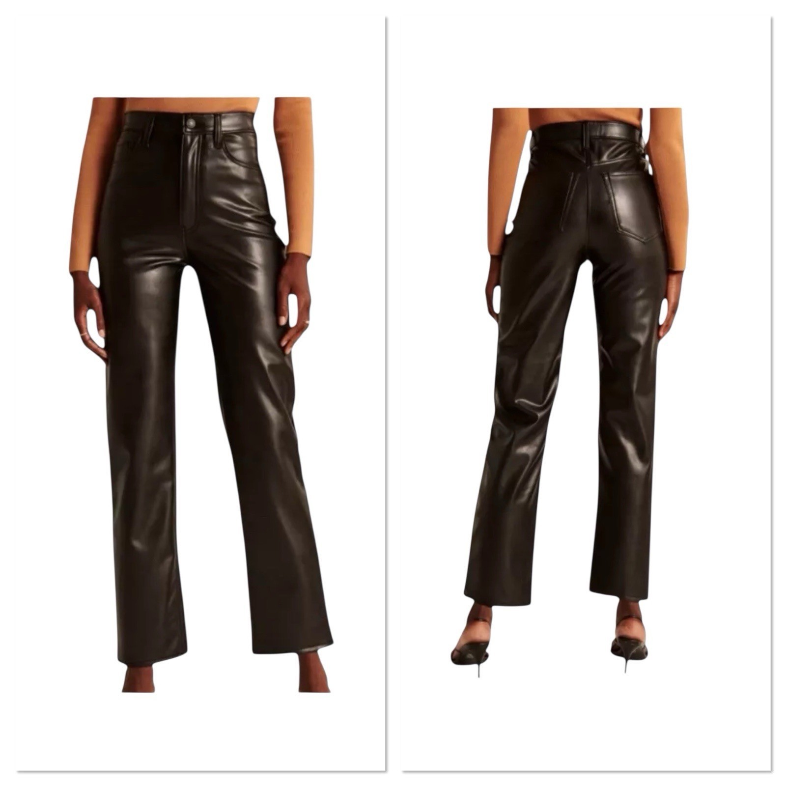 Elevate your style with these ultra-high rise black faux leather pants from Abercrombie Fitch. Straight leg ankle pants with a 90s vintage vibe, perfect for travel, party or casual occasions. Featuring a zip and button closure, these pants are made with polyester and have a comfortable stretch for all-day wear. With pockets, these pants are perfect for women who love to carry their essentials with them.