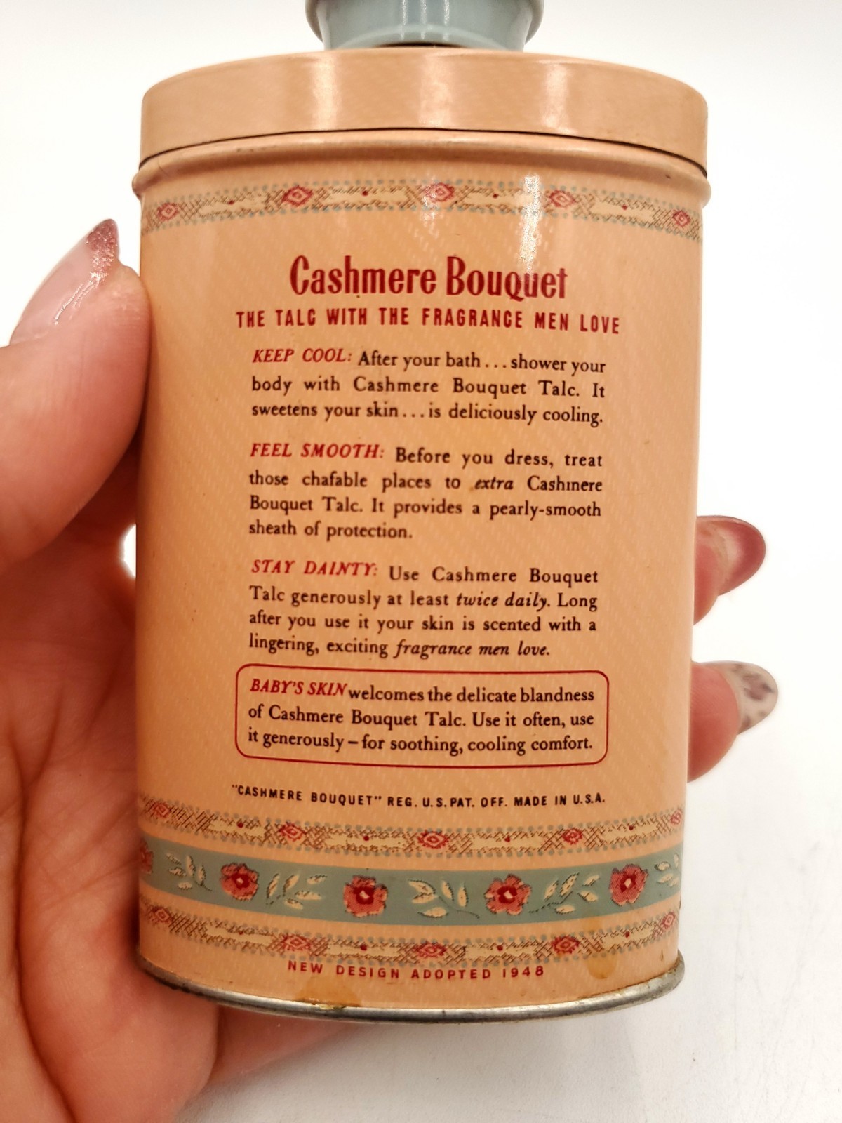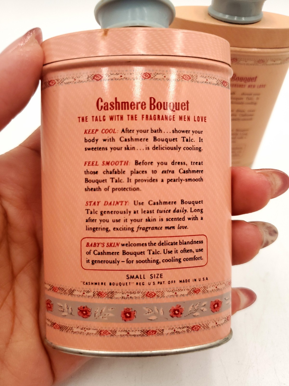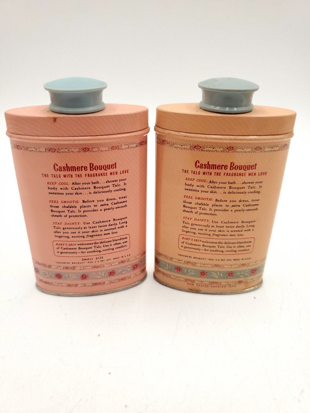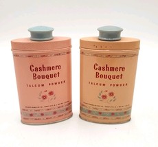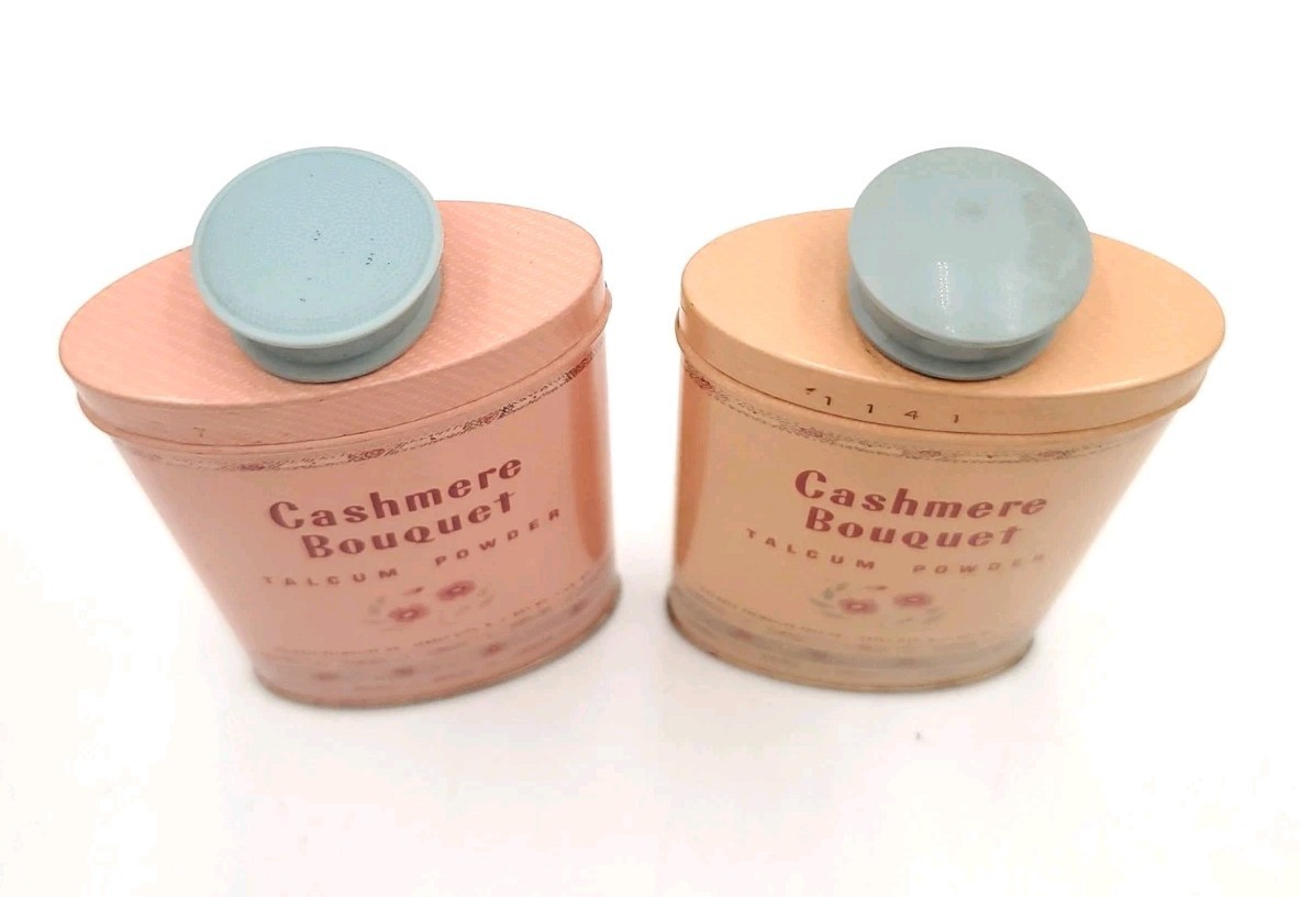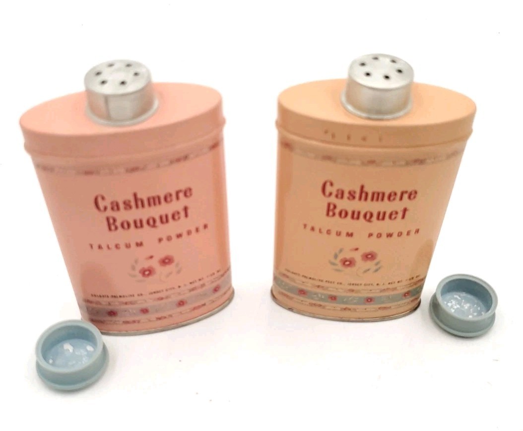 2 Vintage Colgate Palmolive Cashmere Bouquet Talcum Powder Metal Tins Pink