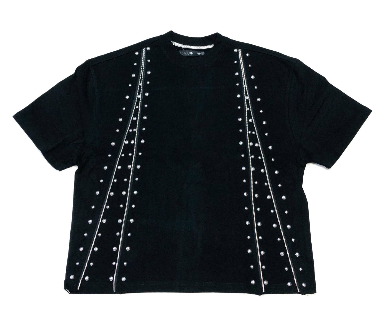 Heavy weight oversized boxy fit tee, Cut and sew, Metal Zipper, Dome studded applique design.