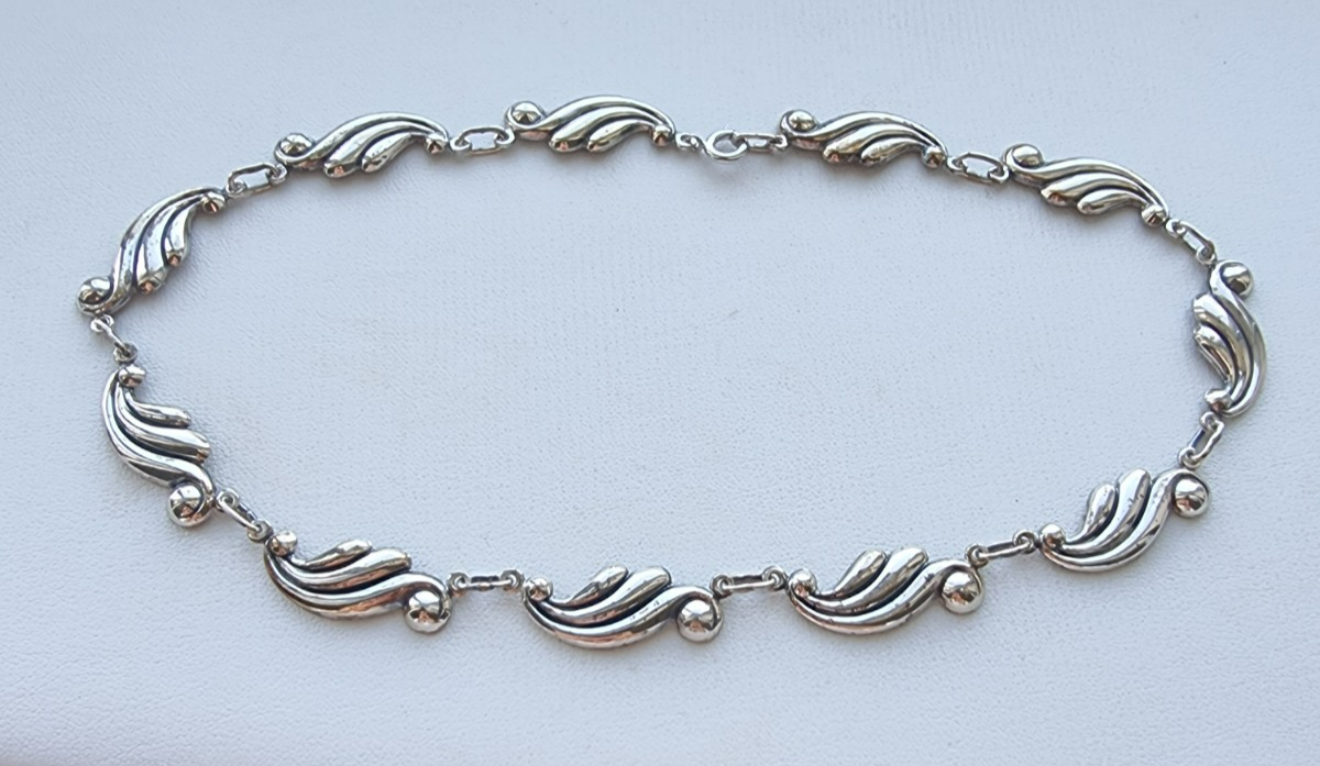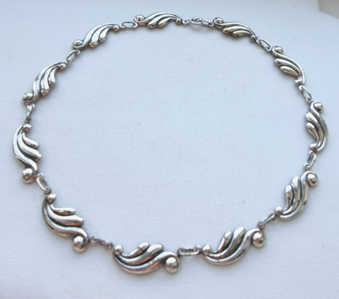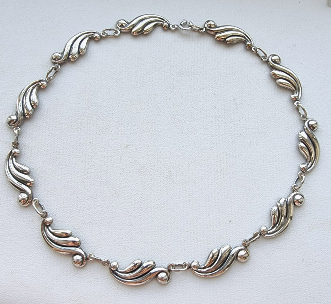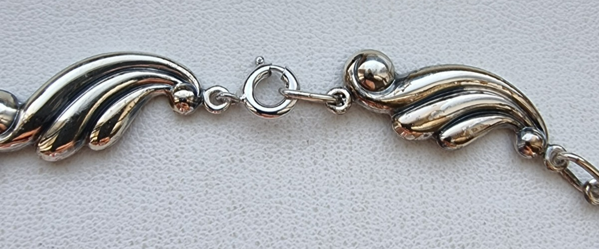 The DANECRAFT Art Deco 925 Sterling Silver Angel Wing Necklace is a beautifully crafted piece of fine jewelry. Featuring a choker style design with a spring ring closure, this necklace is signed by the brand Danecraft. Made from high-quality sterling silver, it exudes a sense of beauty and elegance. The intricate detailing of the angel wing design adds a touch of sophistication to any outfit, making it a perfect accessory for both formal and casual occasions.
