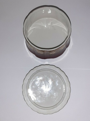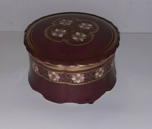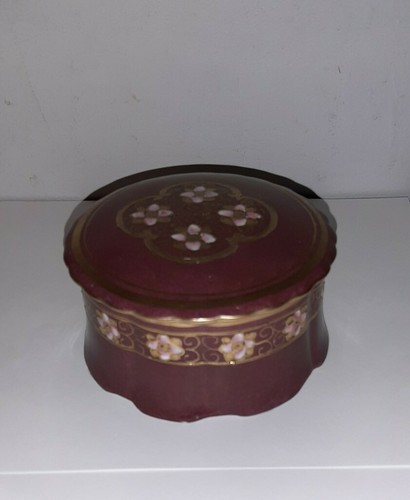 Vintage H. F. P Macau Toyo Golden Floral Trinket Dish With Lid Red and Gold. This is approximately 2.5 inches tall and 4.75 inches in diameter.