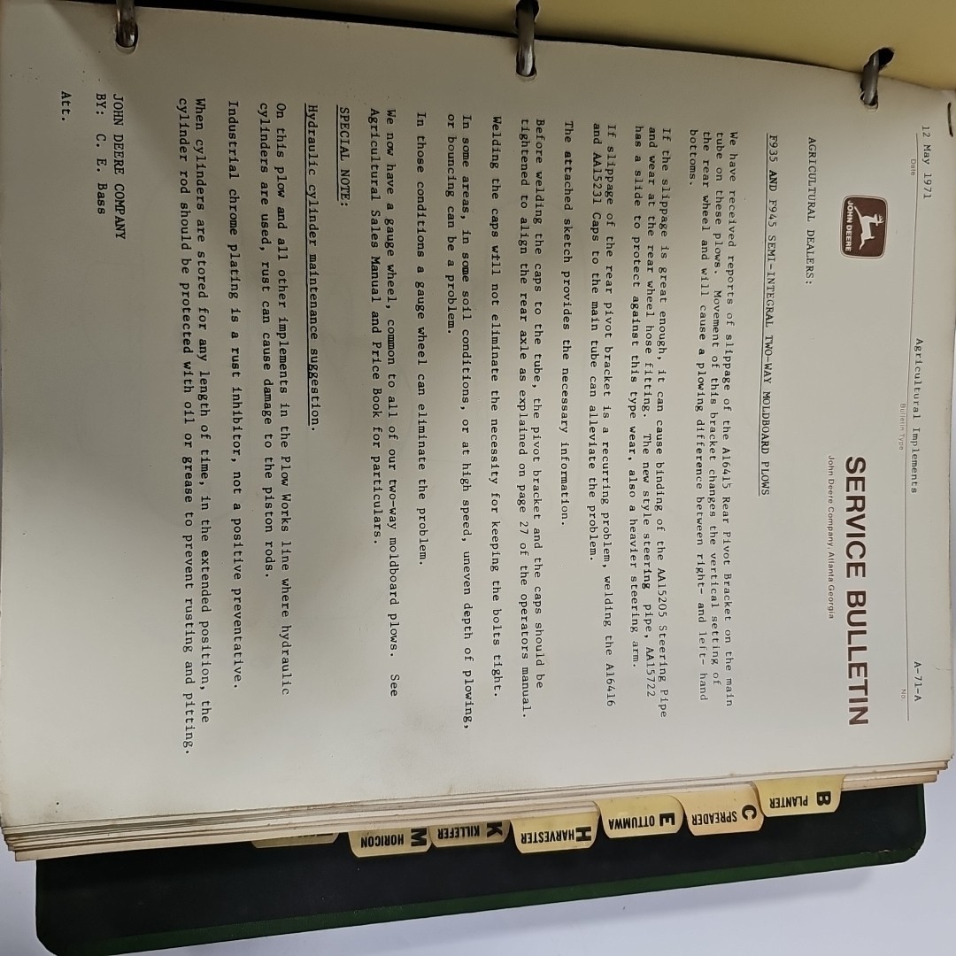 The product is a set of vintage John Deere agricultural implement service bulletins from 1971 and 1973, bound in a single binder. These manuals provide maintenance and repair instructions for various John Deere farm implements, specifically from the model year 1971. The bulletins cover a range of models and are specific to John Deere equipment. Produced in the United States in 1974, these manuals are a valuable resource for farmers and equipment operators looking to keep their heavy machinery in top condition.