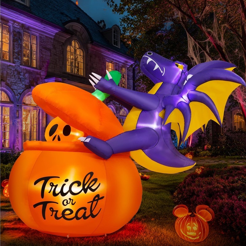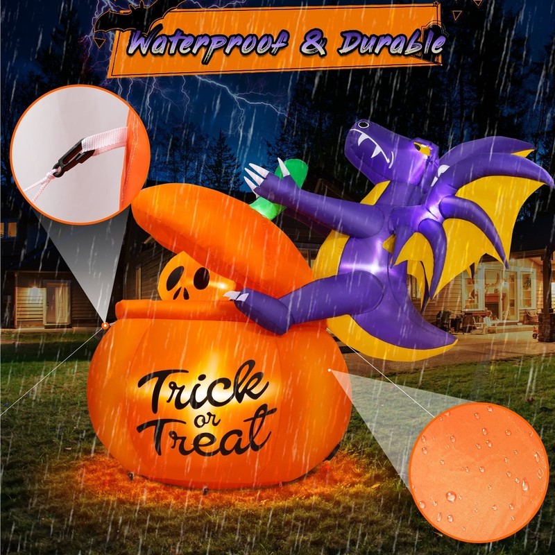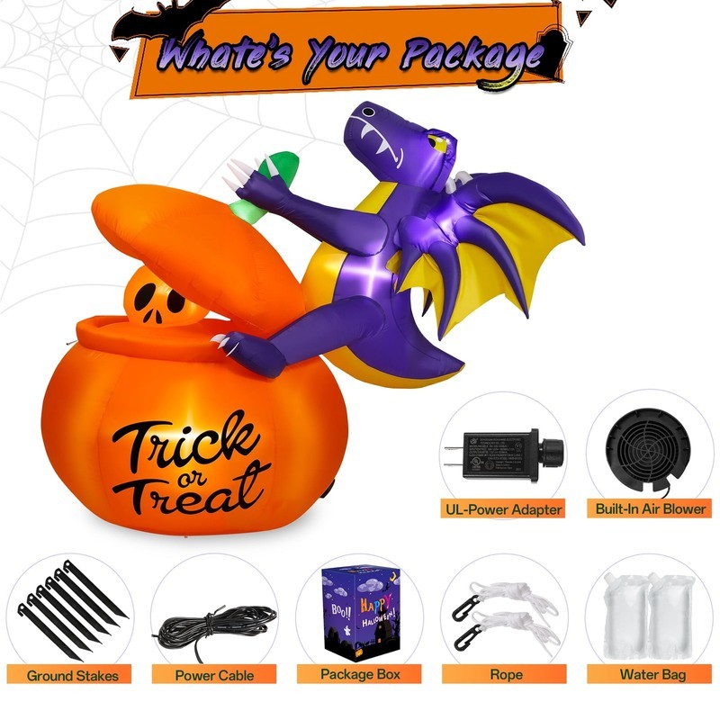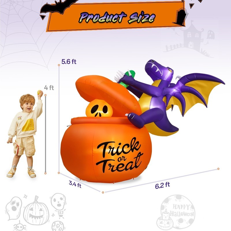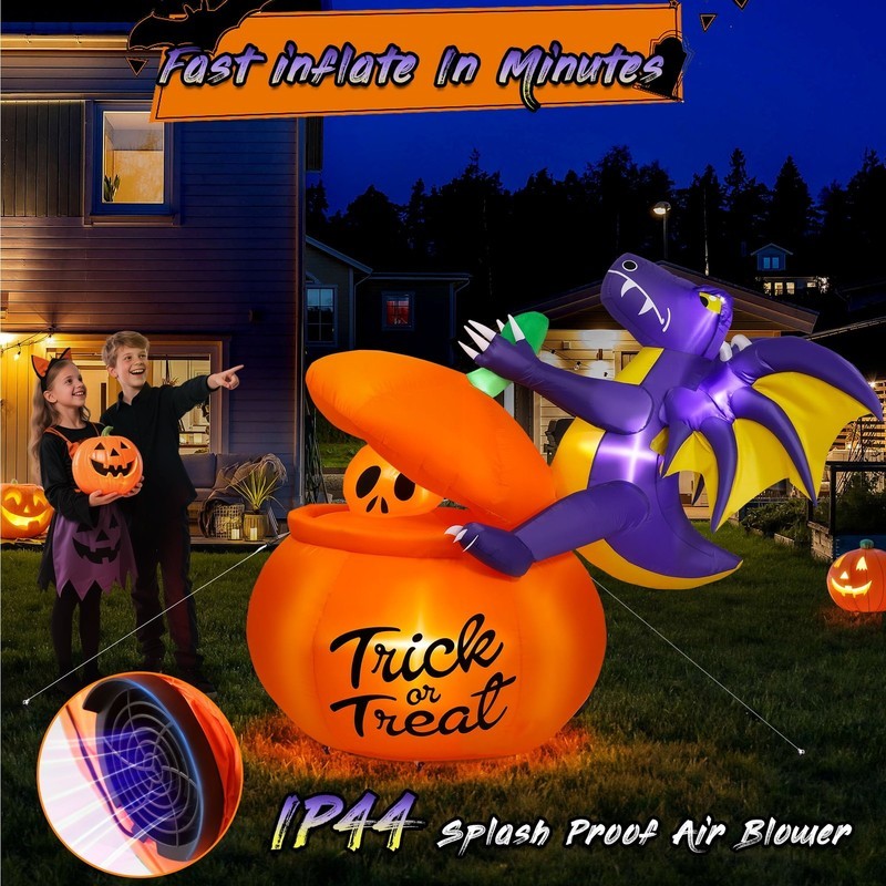 Vrilay Halloween inflatable Dinosaur opens pumpkin lid to reveal a skull face?this funny shape is sure to be loved by children! Built-in bright LED lights, it creates a fun Halloween atmosphere, attracting neighbors and guests, and making your home stand out on Halloween. It comes with a powerful built-in air blower for continuous inflation. The inflatable decoration also provides ground stakes, ropes and waterbag, ensuring the Halloween inflatable is strong enough regardless of weather conditions. This Halloween inflatable is made of high-strength waterproof polyester, which protects against rips and tears. Perfect for Halloween outdoor yard, garden, lawn decorations.