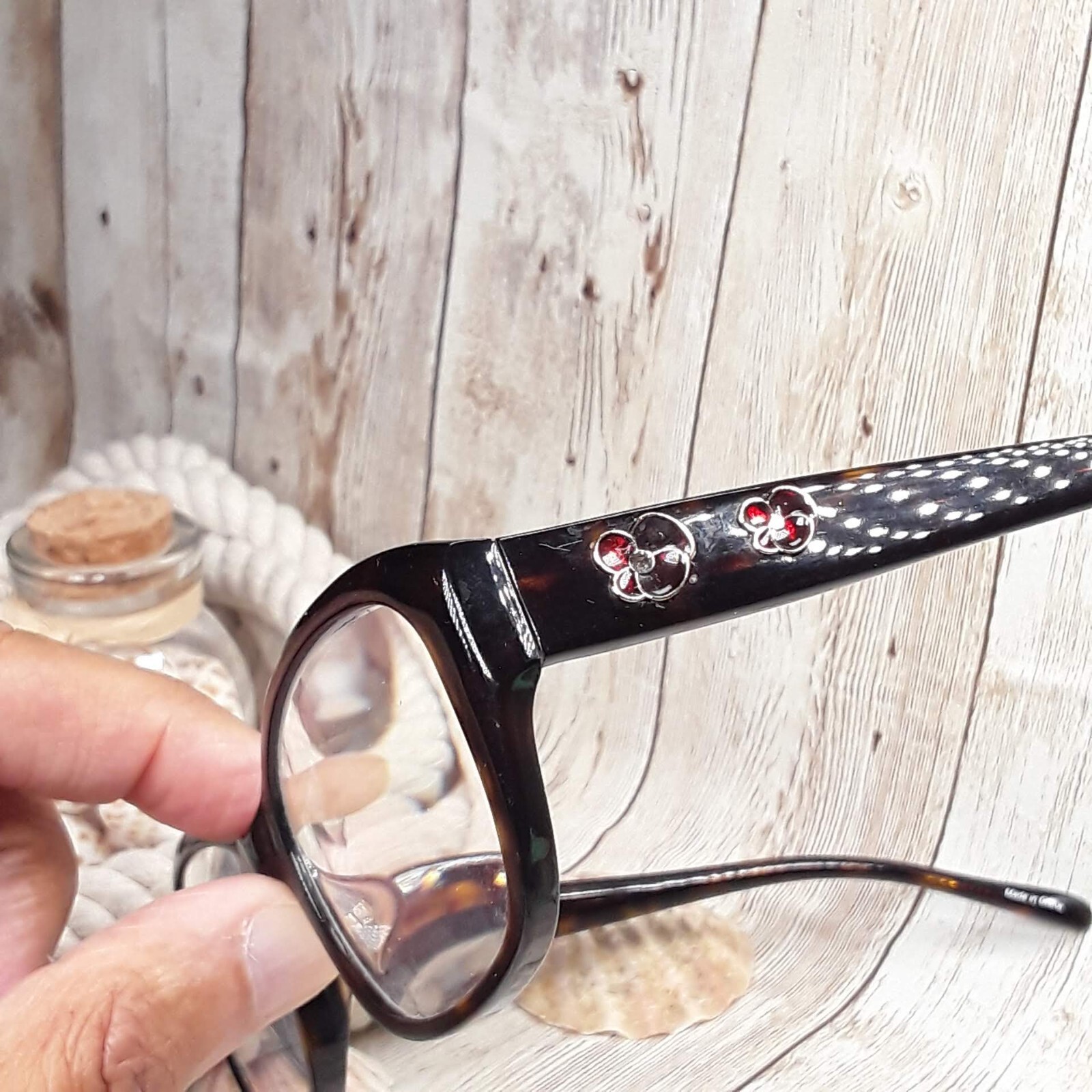 Two red and gold-tone enamel flowers on each temple.