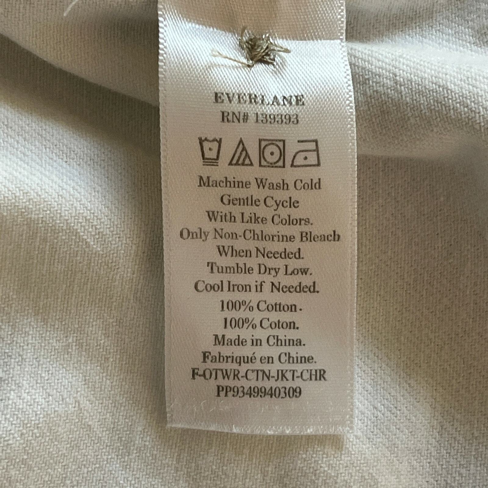 Classic and versatile Everlane ?The Chore Jacket? in crisp white. This timeless workwear-inspired utility jacket is crafted from durable 100% cotton with a structured yet comfortable fit. Features include large patch pockets, button front closure, and cuffed sleeves with button detail. Perfect for layering through all seasons.