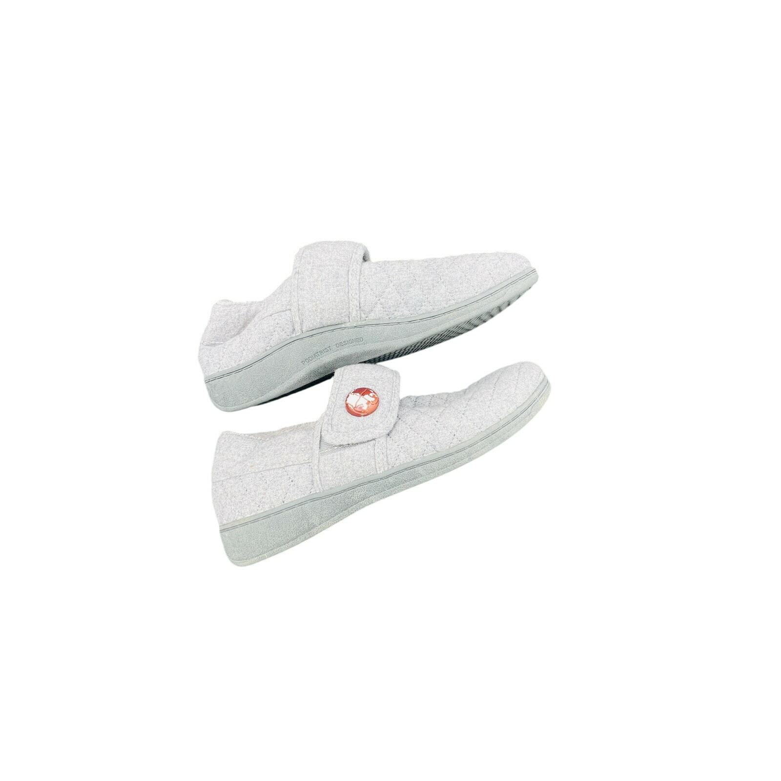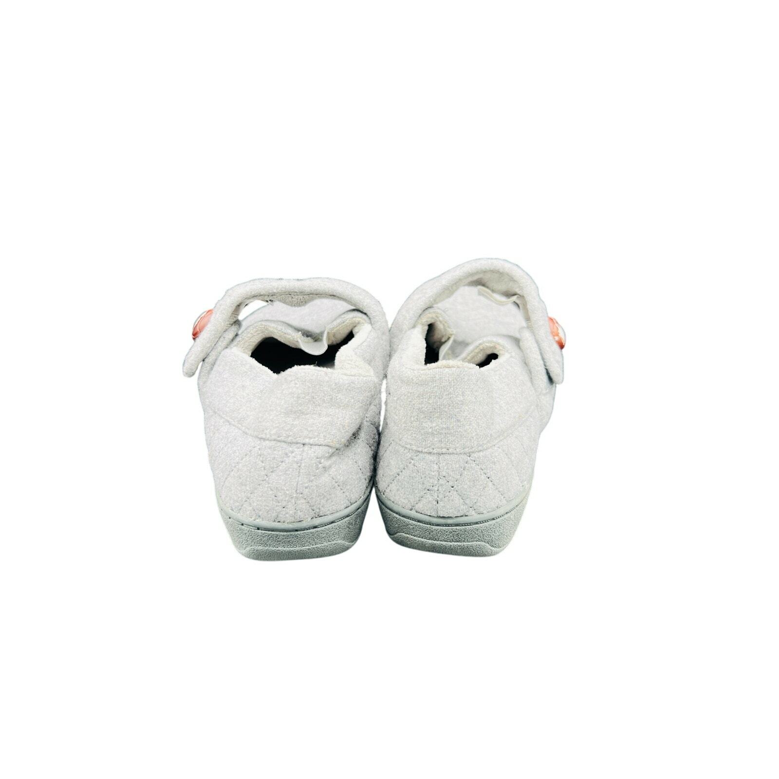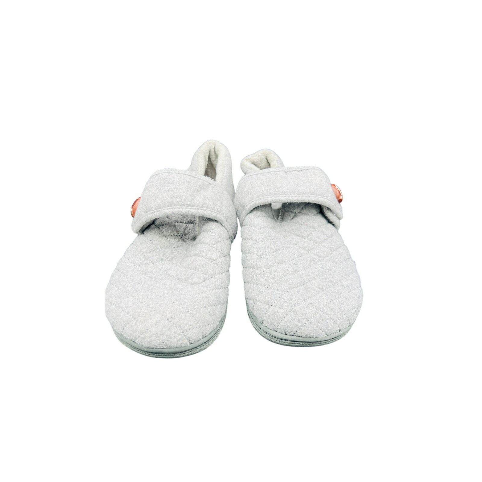 Cozy gray quilted fabric with adjustable Velcro strap and decorative marbled button. Features signature Vionic orthotic footbed and non-marking rubber sole for comfort and support. Made with soft fleece lining. Excellent condition with light use. Great for at-home comfort or supportive indoor wear.