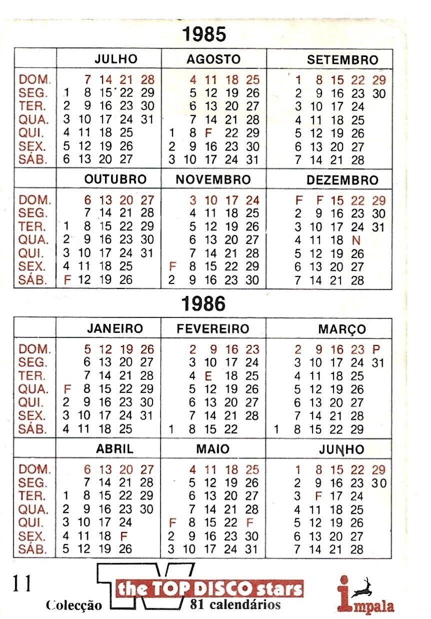 ⭕VTG, card pocket calendar 1985 NEY MATOGROSSO Portugal group music singer