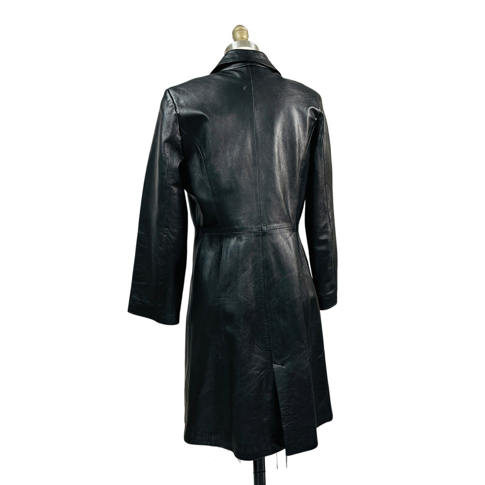 Sleek and timeless, this Vera Pelle black leather trench jacket (Italian size 42, fits women?s M/L) brings together 1980s?90s power dressing with classic Italian craftsmanship. Features a notched collar, two functional front pockets, structured shoulder pads, and a chic back slit for movement. Fully lined in luxurious black taffeta.