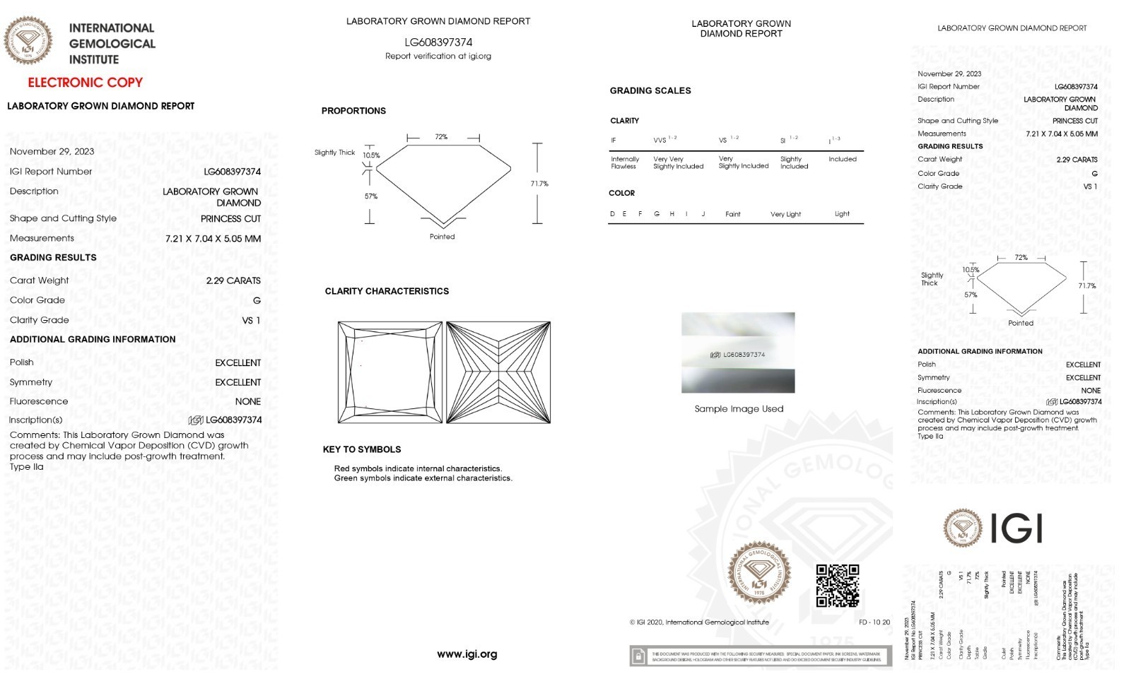 Lab Grown 2.29 Ct PRINCESS Cut IGI Certified CVD Diamond G Color VS1 Clarity