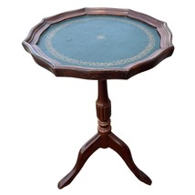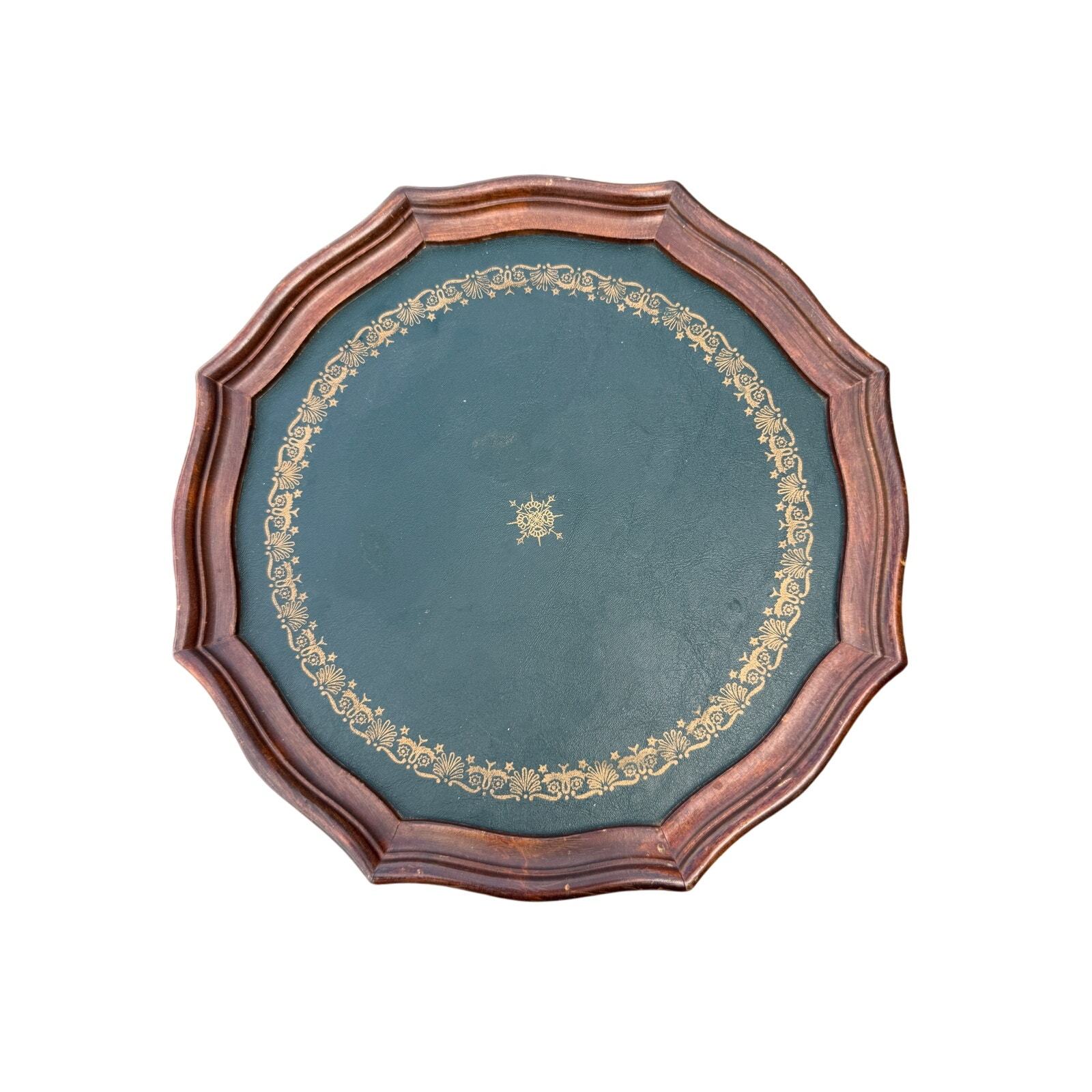 Elegant scalloped ?pie crust? edge table with mahogany finish and leather inset top featuring gold embossing. Measures approx. [your height]? tall [top diameter]? top. Solid wood base with turned central column and tripod legs. Mid-20th-century styling ? perfect as an end table, plant stand, or decorative accent in traditional, cottagecore, or eclectic interiors. Condition: good vintage condition with light surface wear, some patina, no structural damage.