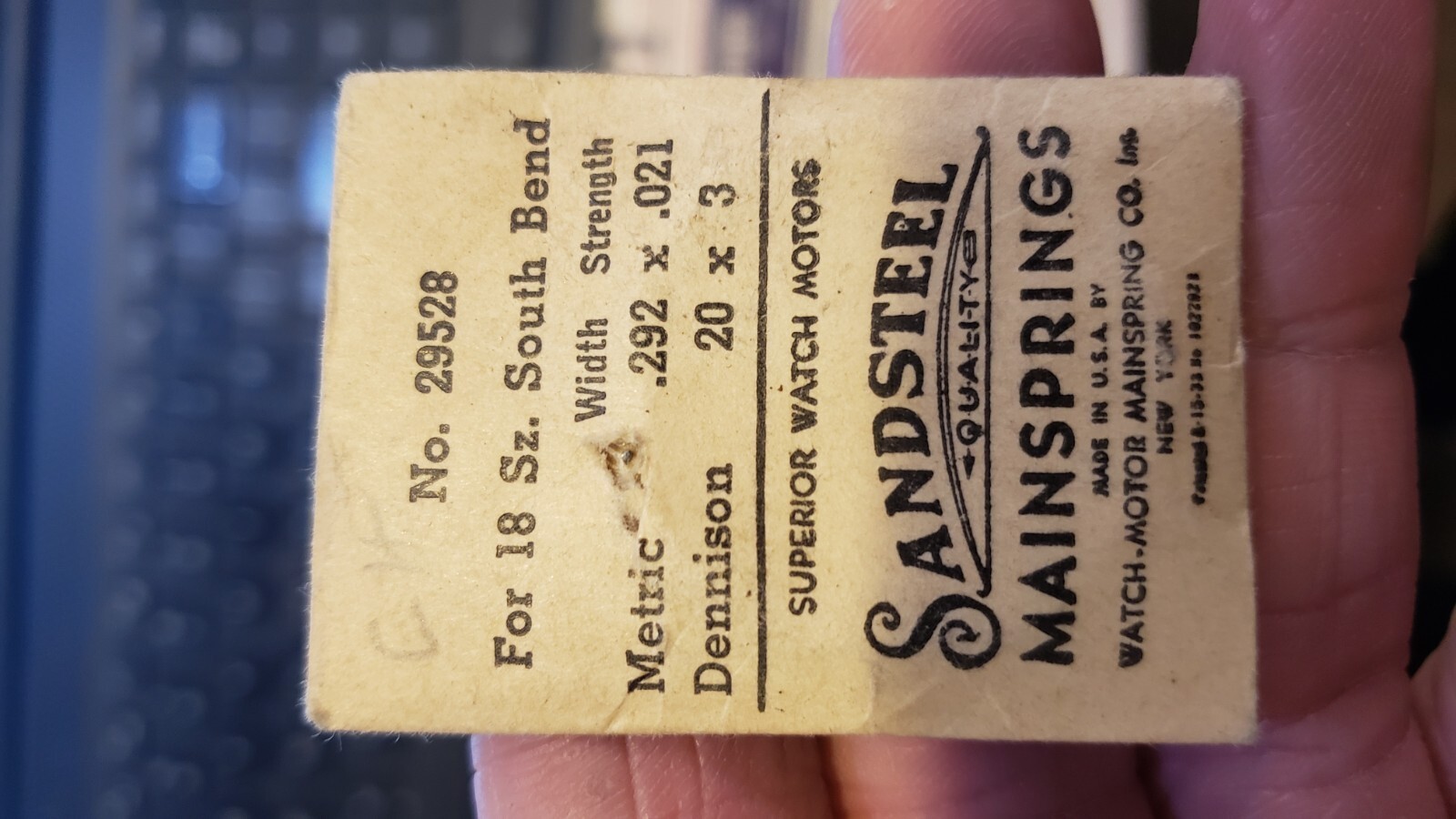 NEW Vintage Sandsteel Mainspring w/ back case Watch 18 sz South Bend No.- 29528 this is a piece of history. If you fix old watches you are in luck. I am not an expert on watches. I bought a big lot of old watch parts from a family watch-repair business that went to auction. They had been in business for 100 years. PLEASE - check out my other vintage watch parts we will be listing more over the next number of months. I will give you a deal if you want multiple orders!! FREE USA SHIP
