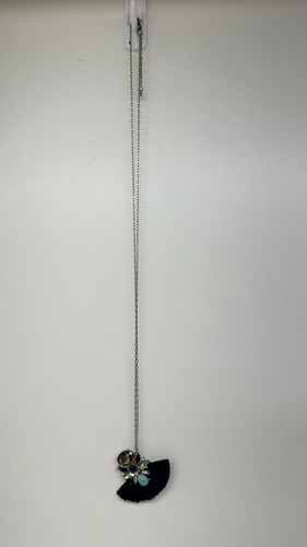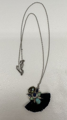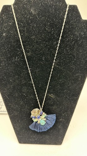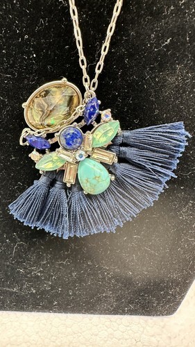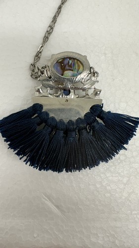This vintage necklace is a unique piece that features a tassel pendant with multiple blue-toned stones. The necklace is made of high-quality materials, including silver and stone, which gives it a durable and long-lasting appeal. The pendant hangs from a 32-inch necklace chain, making it a perfect accessory for any occasion. The necklace's blue stones add a touch of elegance and sophistication to any outfit, while the tassel pendant gives it a fun and playful touch. This necklace is a must-have for anyone who loves vintage and antique jewelry.
