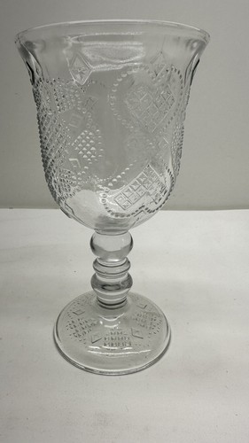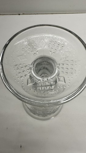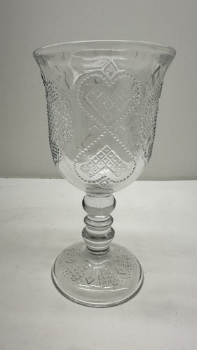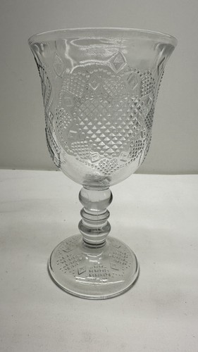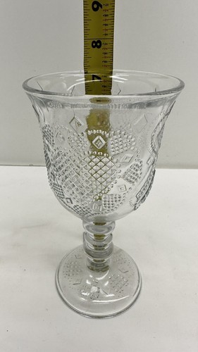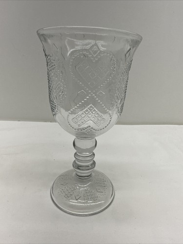 This vintage Avon candle holder is a beautiful piece that features intricate diamond and heart patterns on clear glass. The loving cup shape is perfect for any occasion and can hold mini candles, or be used as a furniture or cup accessory. Handmade with textured finish and weighing 2lb, this piece is a must-have for any romantic theme.