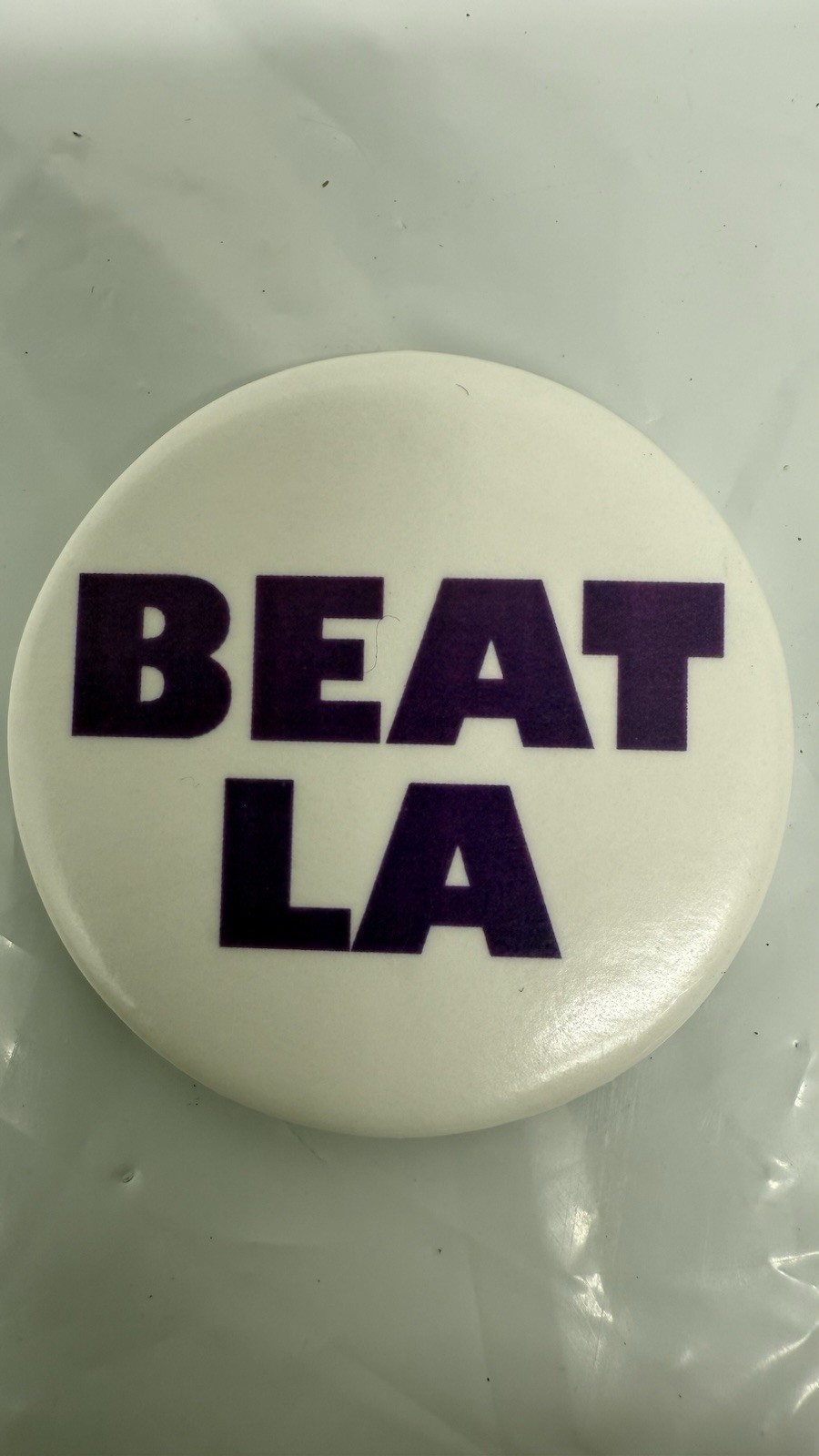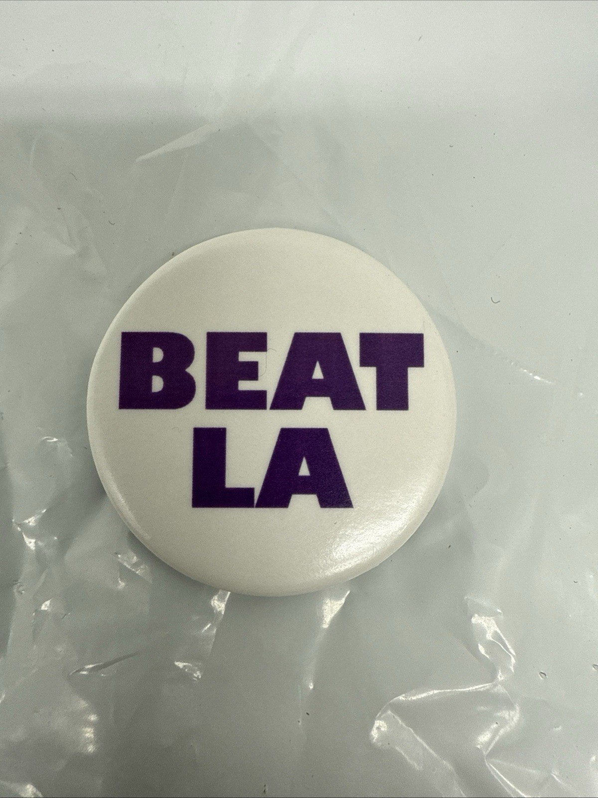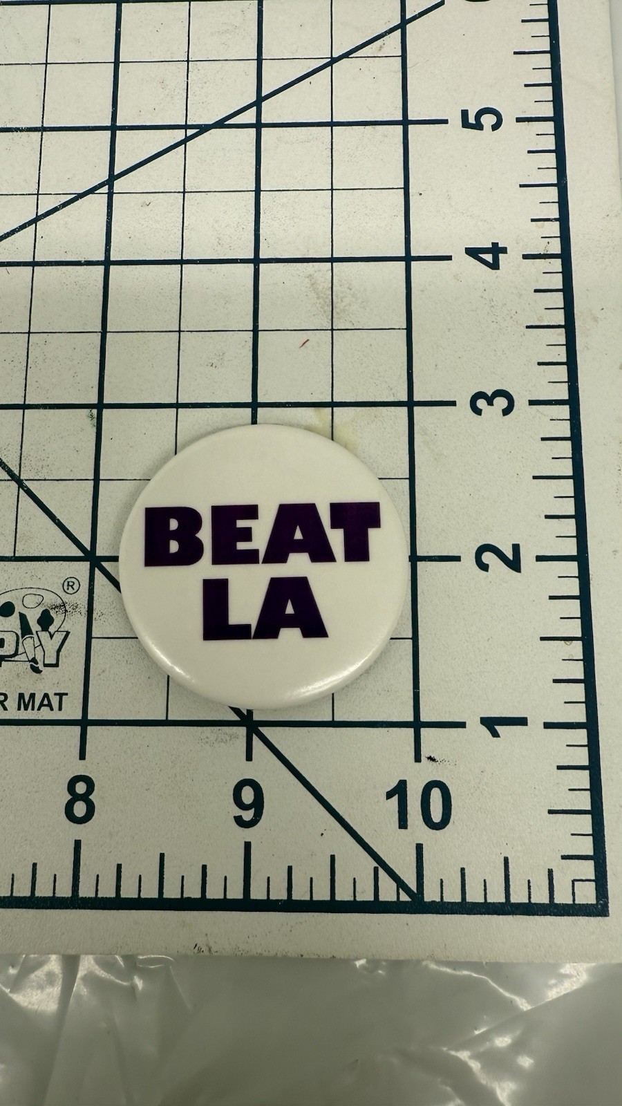 The product is a 1.5? button featuring a purple and white design, with the words "Beat LA" written on it. It is manufactured in the United States and is not handmade. This collectible pinback button is a unique piece that can be added to a collection of various pinbacks and lunchboxes. The design and message on the button make it a distinctive and eye-catching accessory for any pin collector.