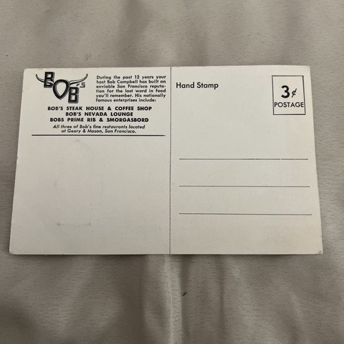 Black & White Hand Stamped 3 Cent Postcard 1958-1962 Bob's Restaurant SF