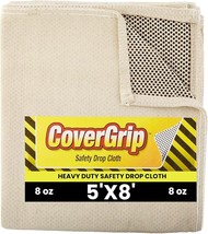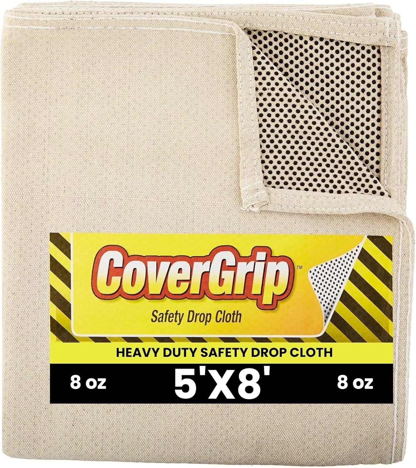 The CoverGrip 5808 5x8 ft safety drop cloth is a high-performance, 8-ounce cotton-poly canvas protective barrier engineered to prevent slips, spills, and surface damage during painting, remodeling, moving, and maintenance work. Unlike traditional drop cloths, it features thousands of tiny, rubberized dots on the underside that grip firmly to floors ? including wood, tile, concrete, marble, and metal ? eliminating dangerous sliding and shifting even under heavy foot traffic or equipment. The durable, machine-washable canvas top resists paint, dust, and debris while conforming smoothly to uneven surfaces, and folds cleanly along dotted lines for precise placement in corners, on stairs, or around furniture. Designed for professional and DIY use, it enhances job-site safety and protects valuable surfaces without the need for tape or weights.