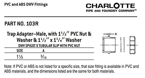 The Charlotte Pipe PVC 00103R 1-1/2-inch Schedule 40 DWV male trap adapter is a precision-molded PVC fitting designed to connect a 1-1/2-inch PVC drain line to a standard 1-1/2-inch slip joint nut ? commonly used for connecting to P-traps, tailpieces, and fixture drains in residential and commercial plumbing systems. Featuring a male spigot end that inserts into a 1-1/2-inch hub and a threaded slip joint nut interface on the opposite end, it provides a secure, solvent-welded connection to PVC pipe while allowing for easy, tool-free attachment to the slip joint components of sink or tub drains. Constructed from rigid, UV-stabilized Schedule 40 PVC, it resists corrosion, chemical degradation, and thermal stress, ensuring long-term reliability in gravity-fed drain, waste, and vent (DWV) applications.