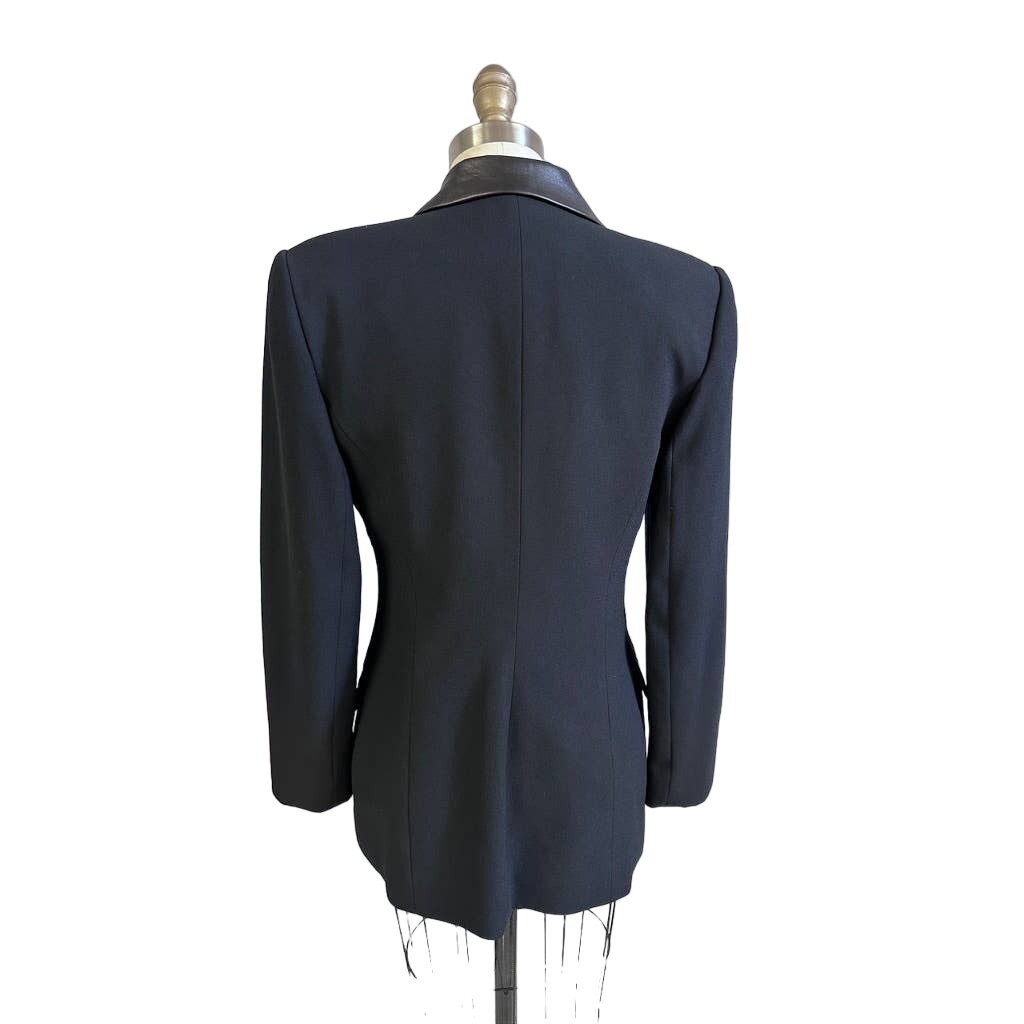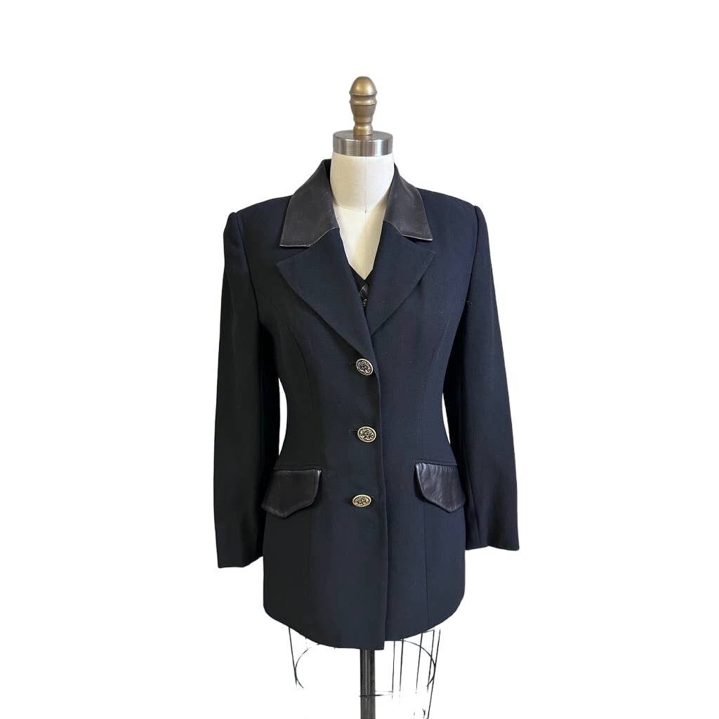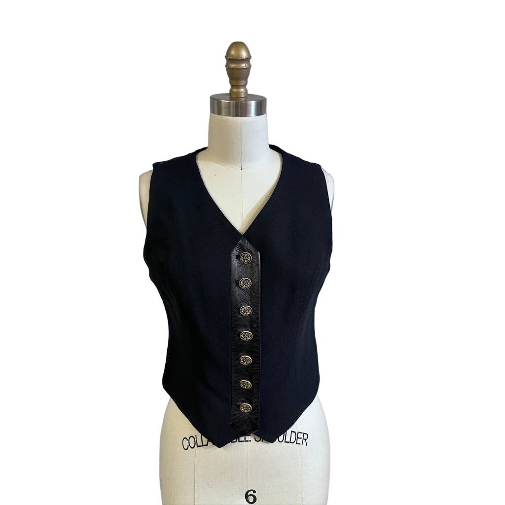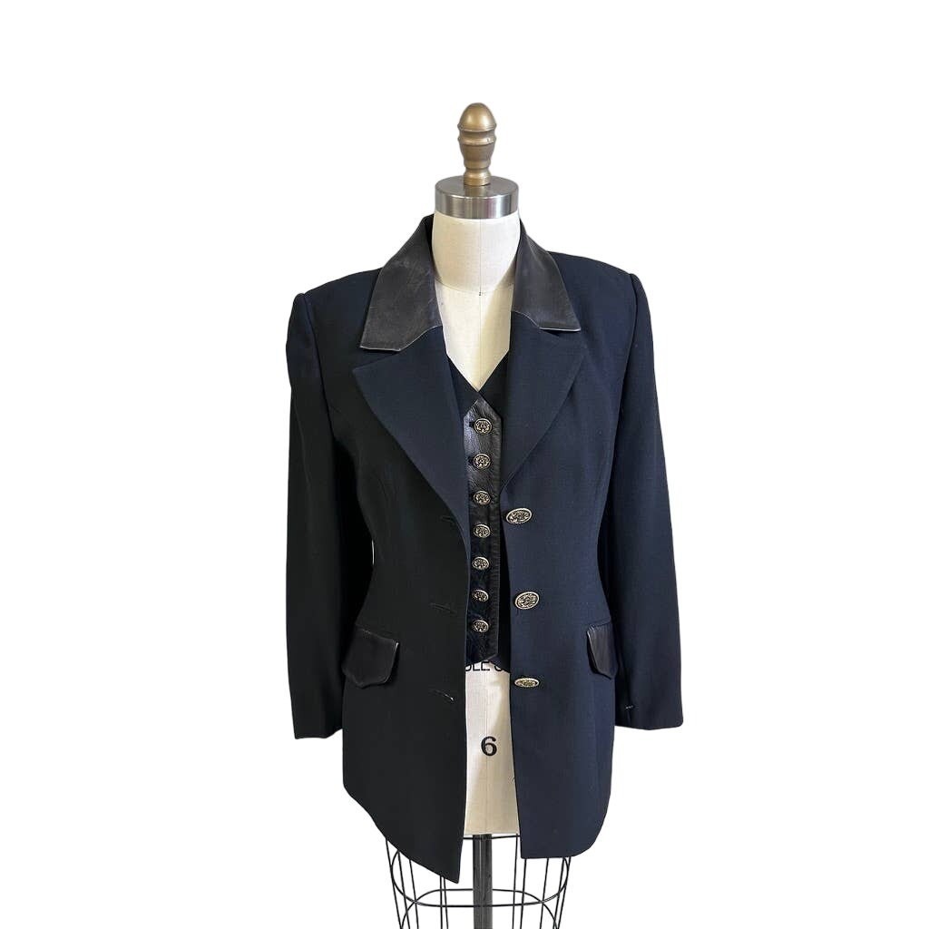 Striking vintage Alberto Makali 3-piece pant suit in black with luxe leather details. Includes a long tailored jacket with leather collar and faux pocket accents, a fitted vest with leather trim and ornate gold/black lacquer buttons, and pleated trousers. A bold and versatile ensemble that captures the dramatic sophistication of late 1980s?1990s fashion.