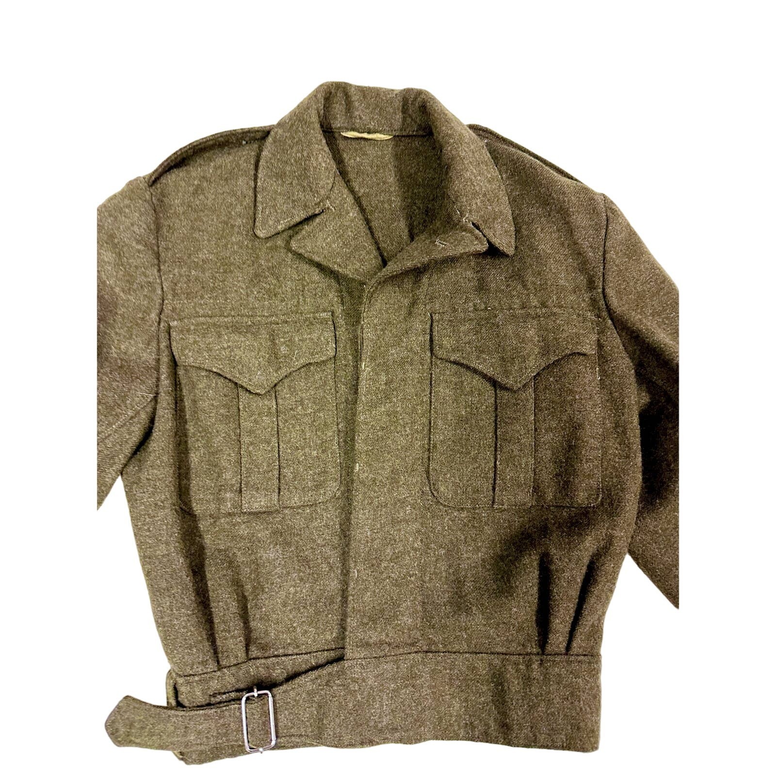 Authentic Miller Gabbe Limited U.S. Army wool jacket, dated 1955. This cropped military coat features double front breast pockets with hidden buttons, additional pockets on each sleeve, and a classic button-front closure.