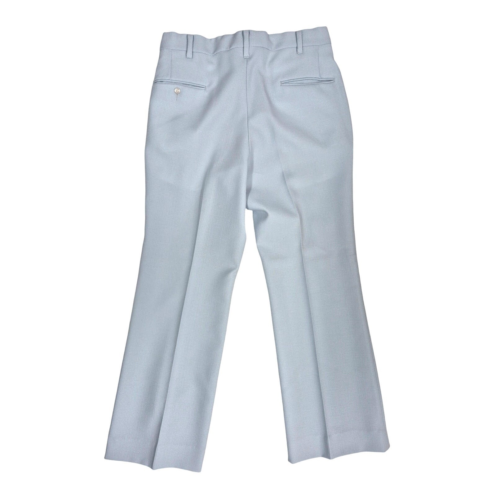 Step directly into the heart of the disco era with this groovy leisure suit in a quintessential powder blue. This is a rare find in such pristine condition, offering an authentic 70s look as if it just stepped off the department store rack.