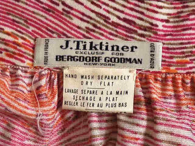 Jacques Tiktiner (1920?1982) was a Parisian couturier known for luxury ready-to-wear and artistic fabrics. His label ?J. Tiktiner? was retailed in elite stores like Bergdorf Goodman, appealing to women seeking elegant, wearable couture. Tiktiner?s painterly prints remain highly collectible for their artistry and quality.