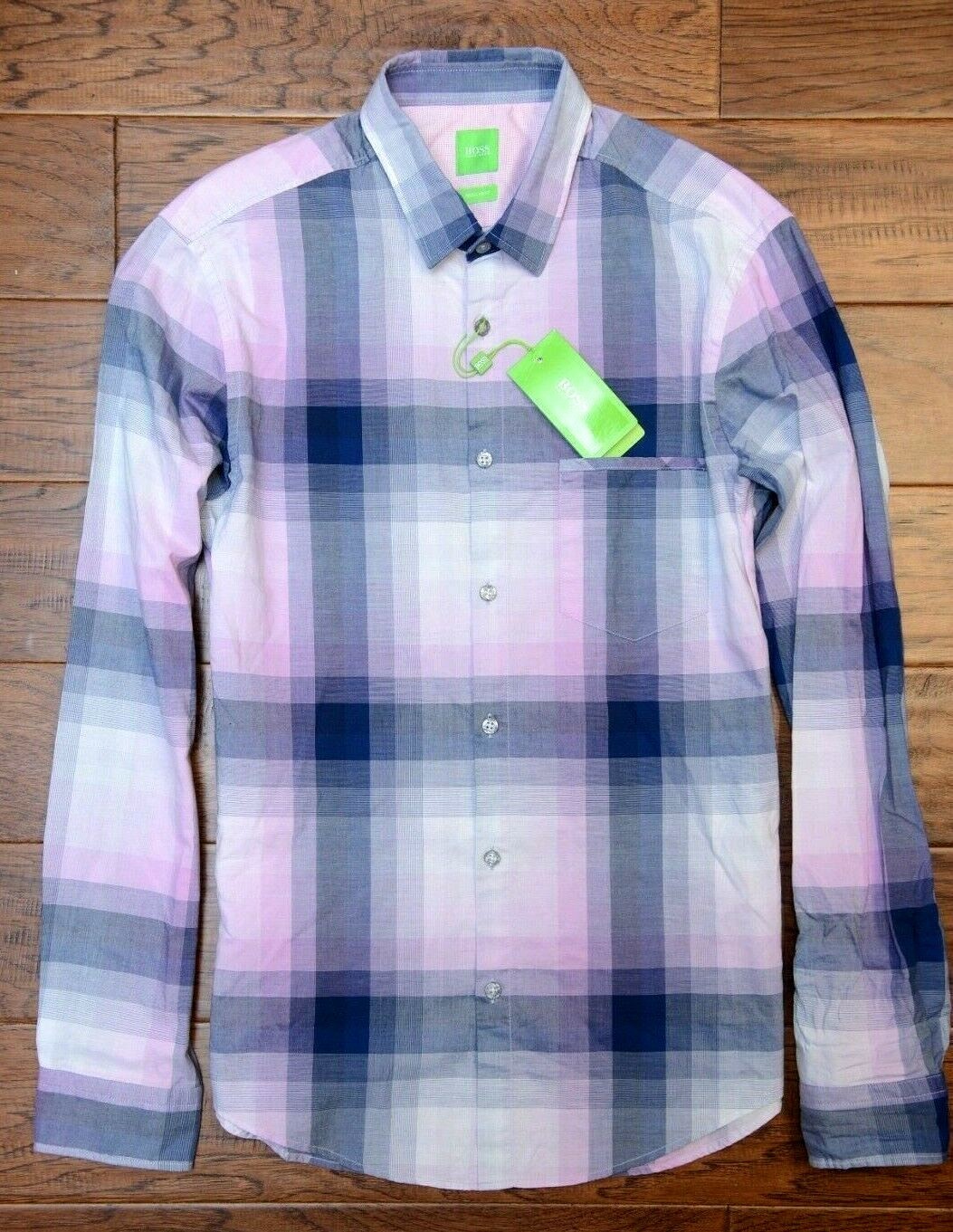 NWT Hugo Boss Manner Bansi regelmaßig Fit Blue/Pink Checks Cotton Sport Casual Shirt
