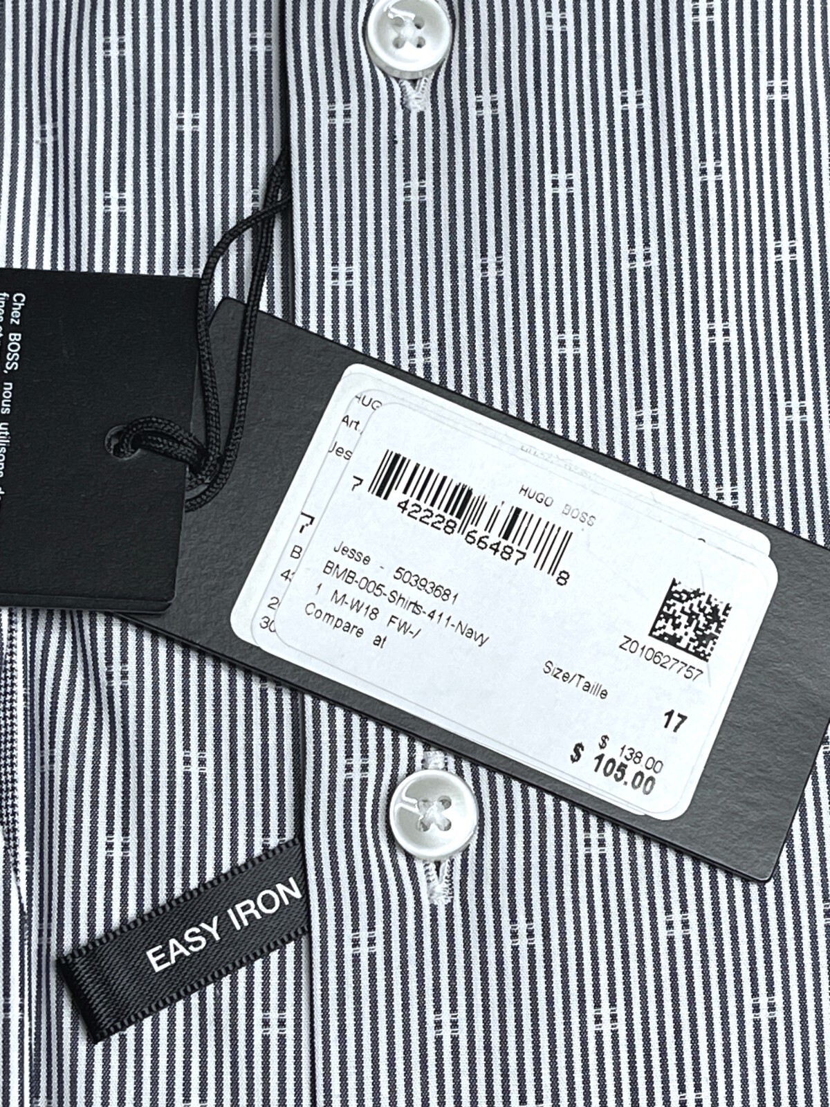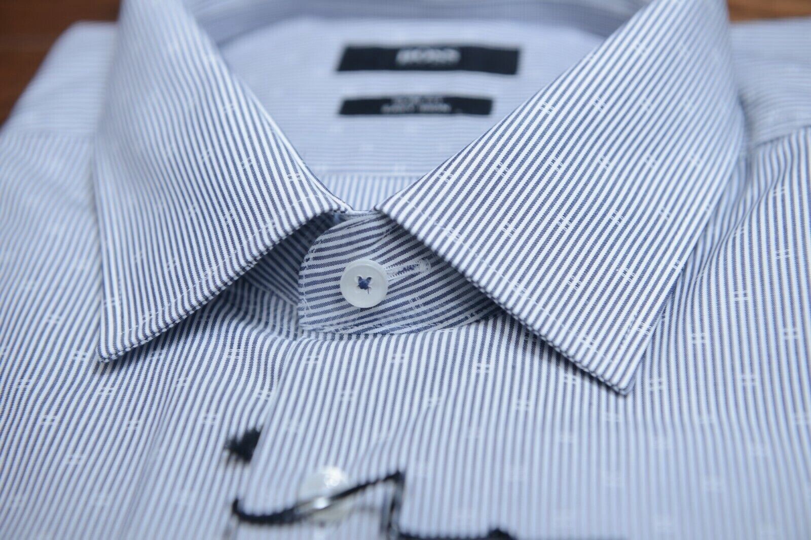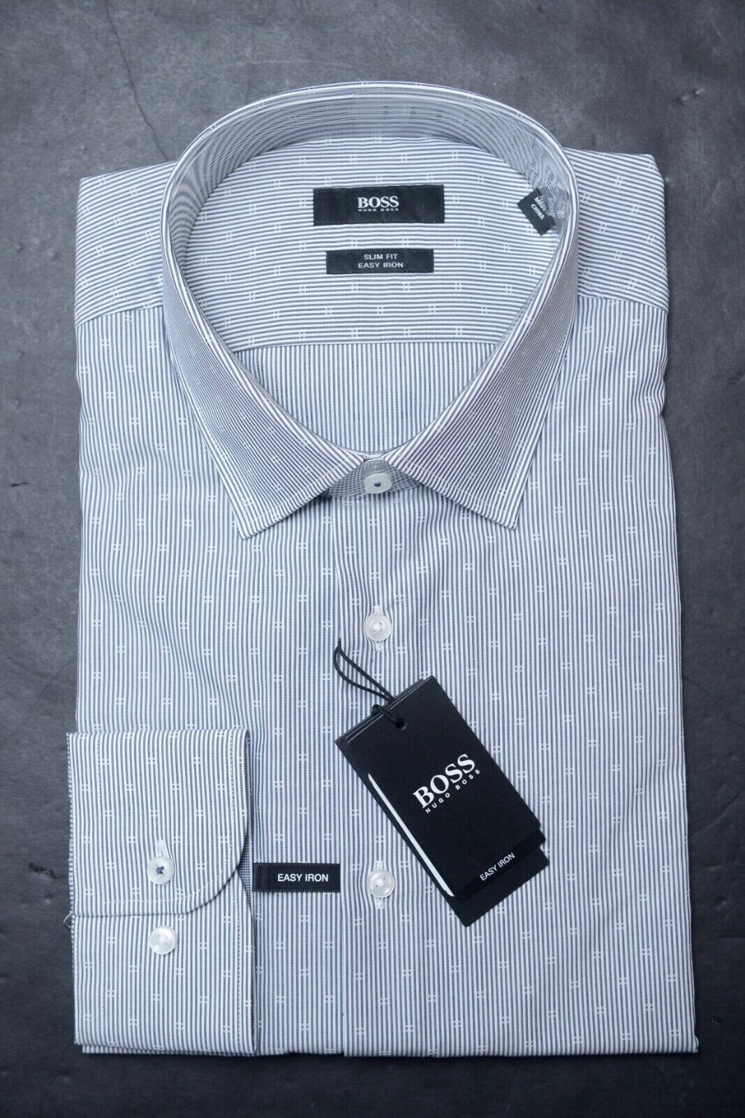 HUGO BOSS Hombre Jesse Ajustado Facil Hierro Algodon Navy Rayas Camisa 43 17