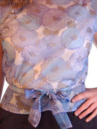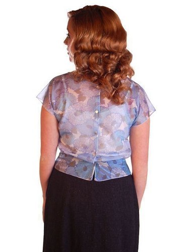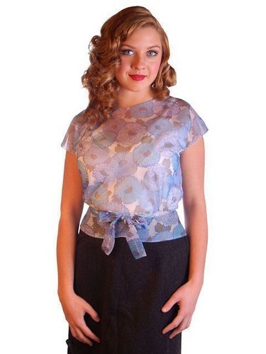 Charming vintage 1950s sheer nylon blouse in a soft blue floral print. Features a wide boat neckline, cap sleeves, darted bodice for fit, and a bow-trimmed peplum waist. Back button closure adds to the authentic mid-century styling. The interior is lined in sheer buff nylon, giving the blouse structure and modesty while maintaining its delicate effect.