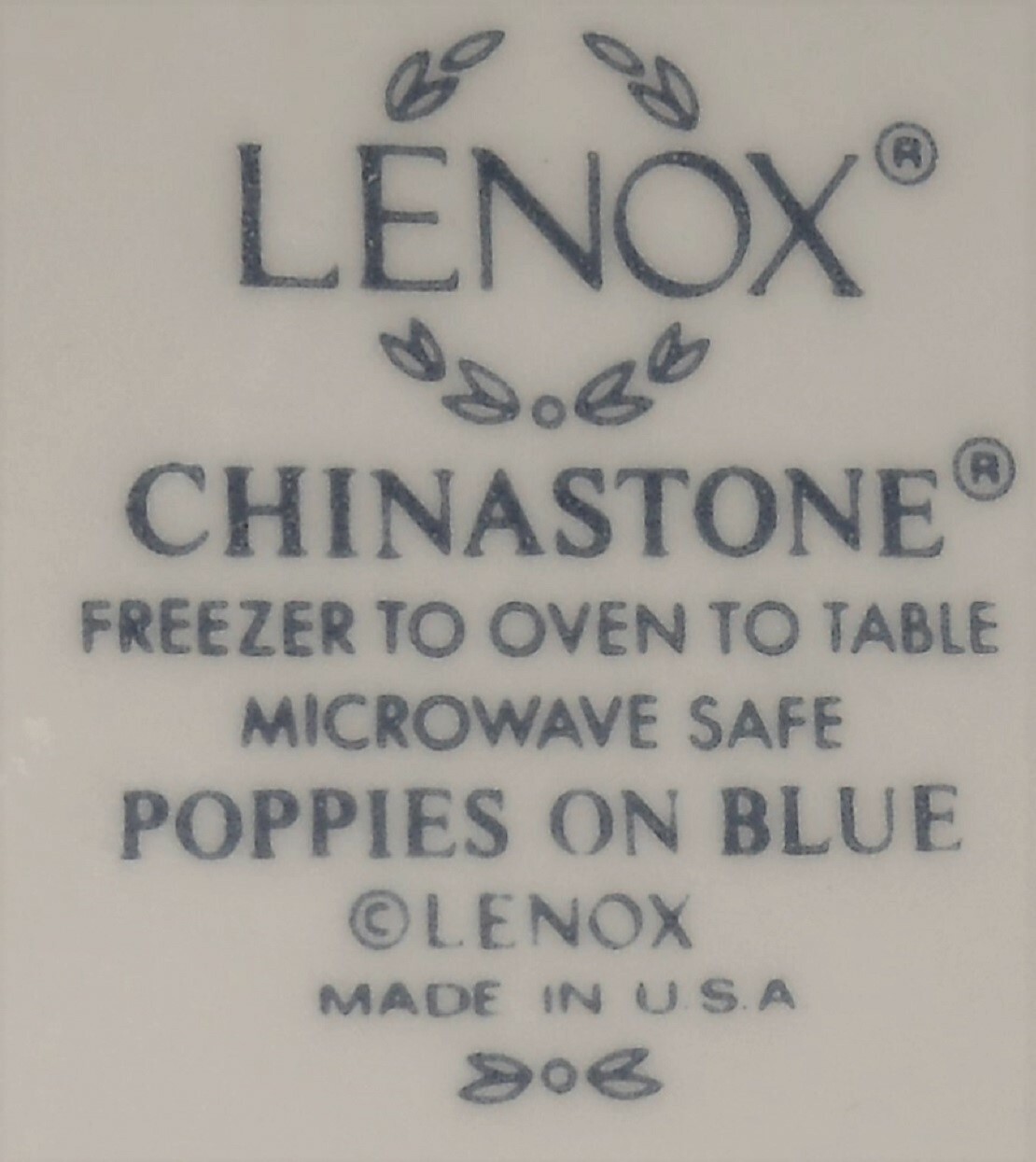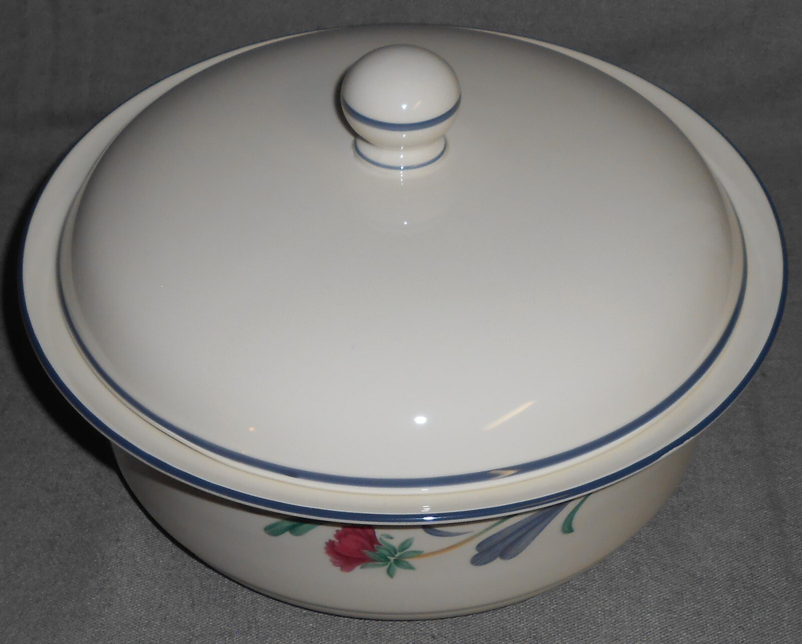 This is the Two Quart Round Casserole w/Lid that measures approx 9 5/8" wide and approx 3 1/4" tall from Lenox in the Poppies on Blue Pattern and Made in the USA. It is in good pre-owned condition with no chips or damage.