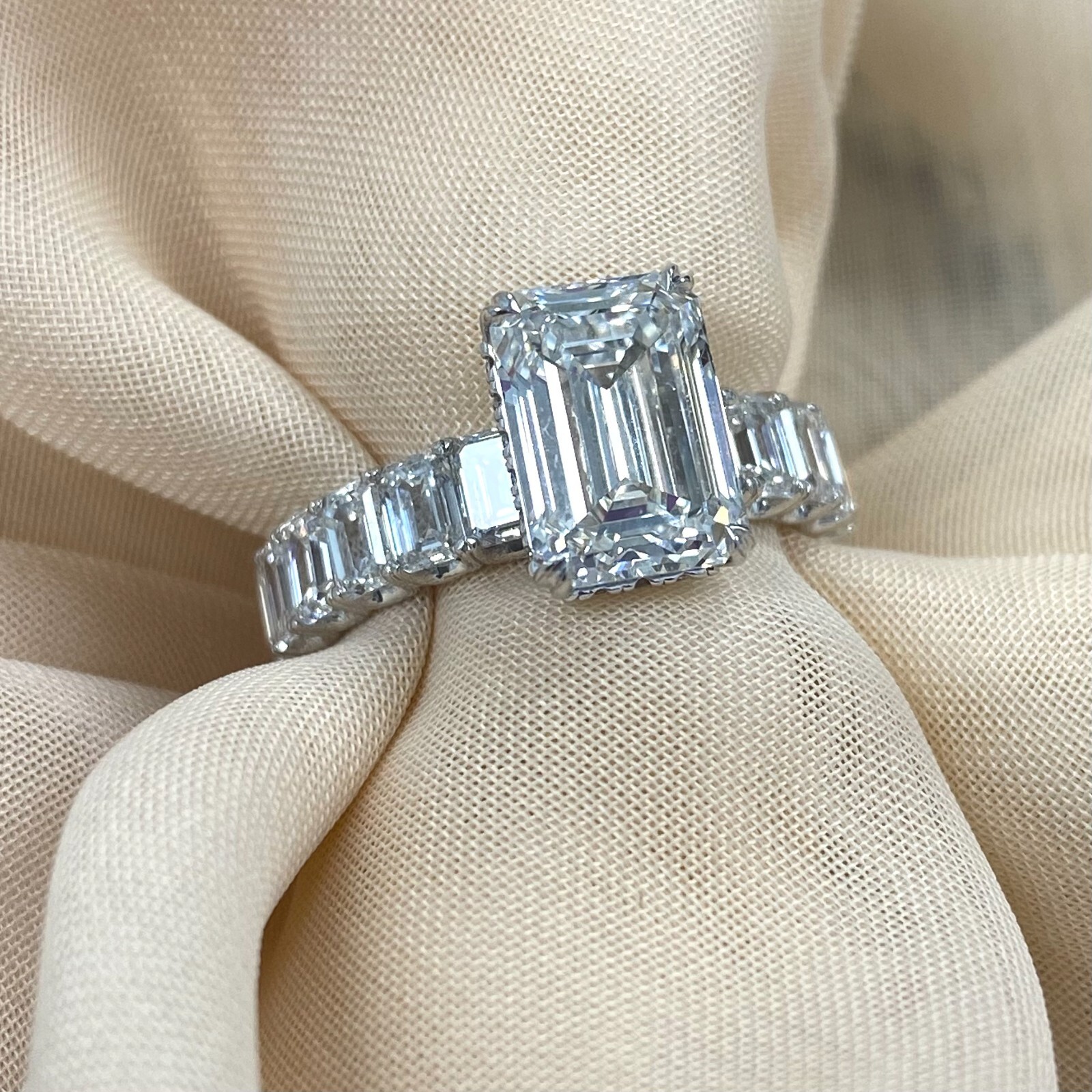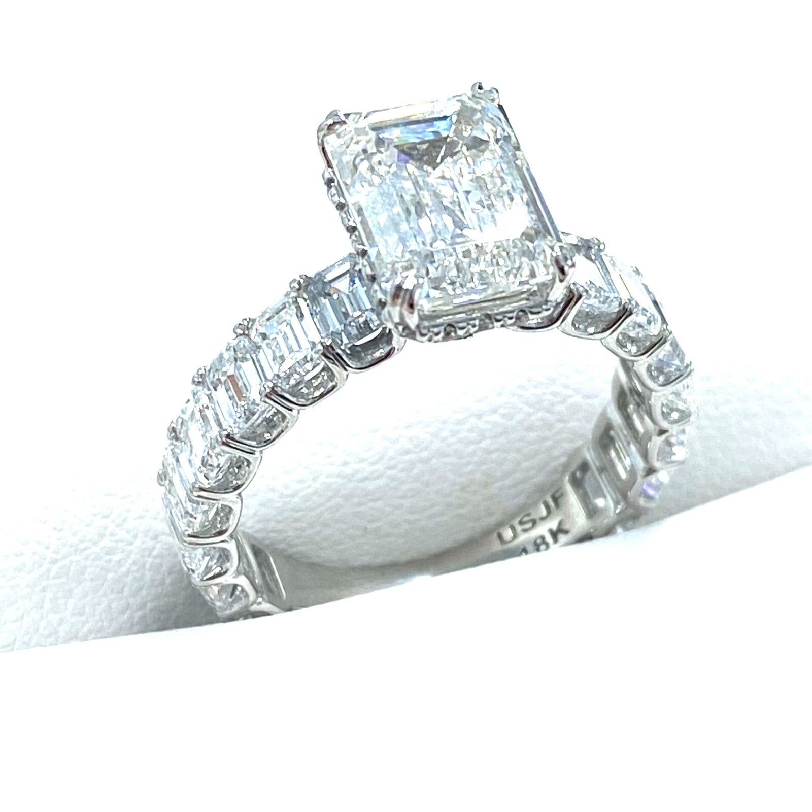 Make a bold statement with this exquisite emerald cut lab grown diamond engagement ring. Crafted in lustrous 18k white gold, this ring features a stunning centerpiece: a 3.05 carat E Color VVS2 Clarity lab grown diamond with a emerald cut. Adding to the ring's allure is a hidden halo design, where round cut small diamonds are set beneath the center stone to create the illusion of a larger diamond. The band features emerald lab grown diamonds set in an eternity style, symbolizing the unending love and commitment between you and your partner. The total carat weight is 6.38 carats. Our products are all hand made with quality and care, in the heart of the diamond district on 47th Street in New York City. Our dedication and commitment to fine work and quality exceeds all others. Since all of ou