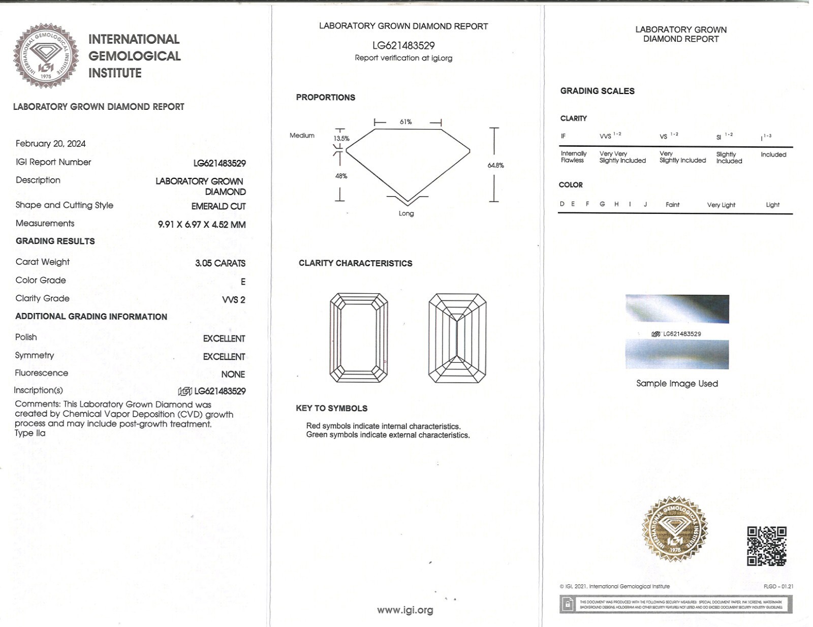 Engagement Ring IGI 3.05 Ct E-VVS2 Emerald Cut Lab Grown Diamond 18k 6.38 CTW