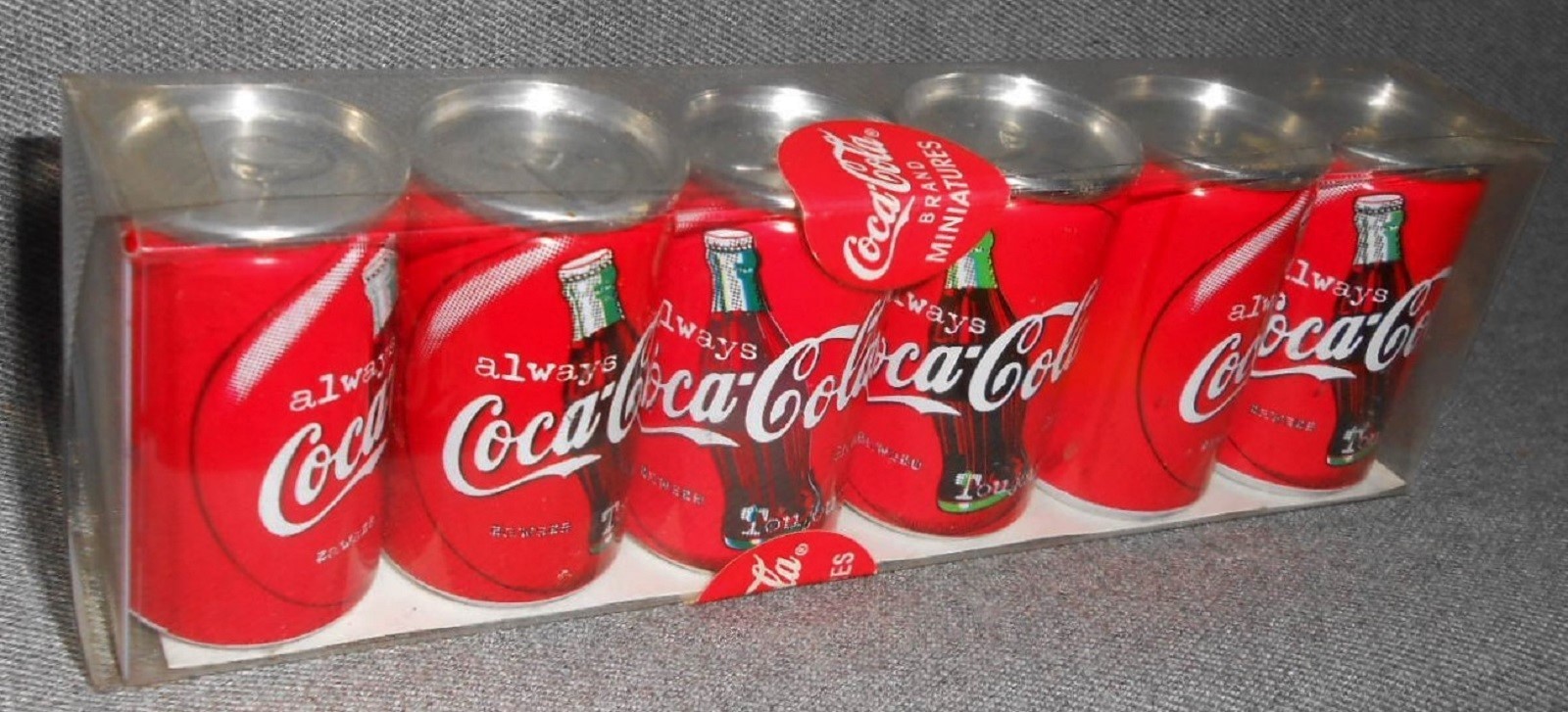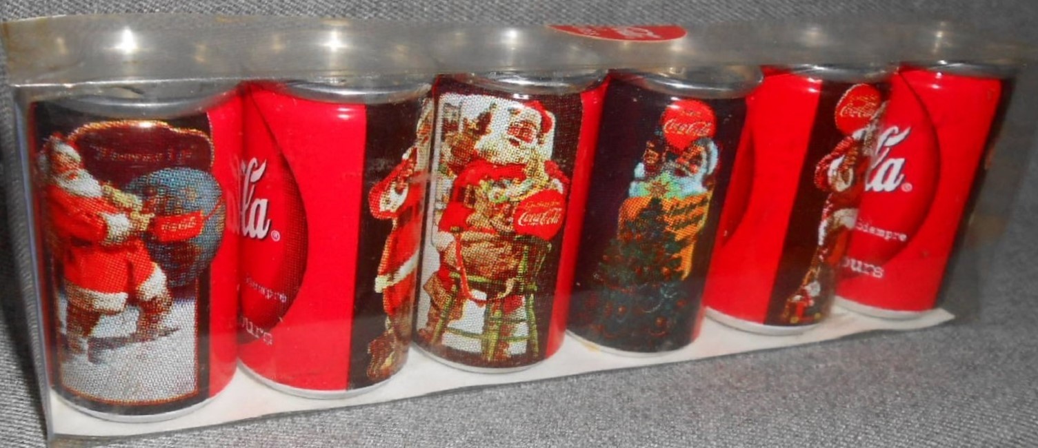 This is a rare set from 1997 which is Mint in the Original Packaging from Coca-Cola that depicts the different Coke Santa Claus's. These are Mini Coke Cans ...not sure if they are full or not - and all six have the Coke Logo on one side an a different Santa on each of the other sides. The set measures approx. 6 3/4" long and the cans measure approx. 2" tall - still sealed and never been out of package. The graphics are clean and have great color...hard to photograph clearly in package with the plastic packaging. The distributer and I am assuming manufacturer is in Italy.