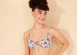 Underwire bikini top from Wild Fable in white with red and pink floral print. Made from nylon with spandex and recycled polyester lining for stretchy comfort in and out of the water. Removable cups offer customizable coverage, while adjustable straps make it easy to find the right fit. Front tie detail finishes off the chic look.