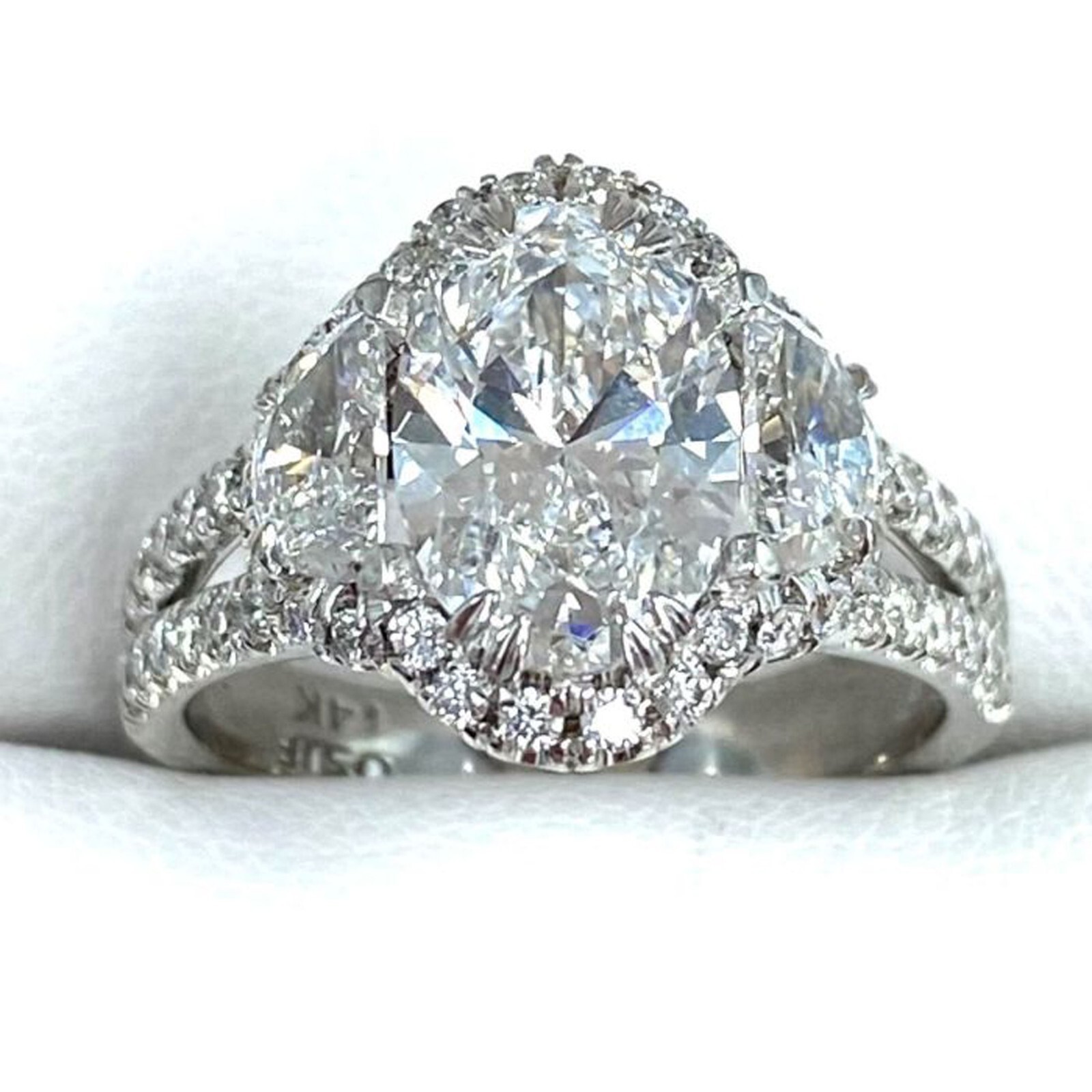 ¡Este anillo de compromiso con espumoso cuenta con un magnífico diamante de laboratorio de corte brillante certificado de 2.07 quilates IGI en su centro! Alrededor de la piedra central hay un halo de cortes redondos cultivados en laboratorio y en el costado 0.78 quilates E/Si Half Moons Lab Grown Diamonds, ¡lo que agrega un toque de glamour y romance al anillo! Hecho a mano en oro blanco de 14k. El peso total de quilates es de 3.70 quilates.