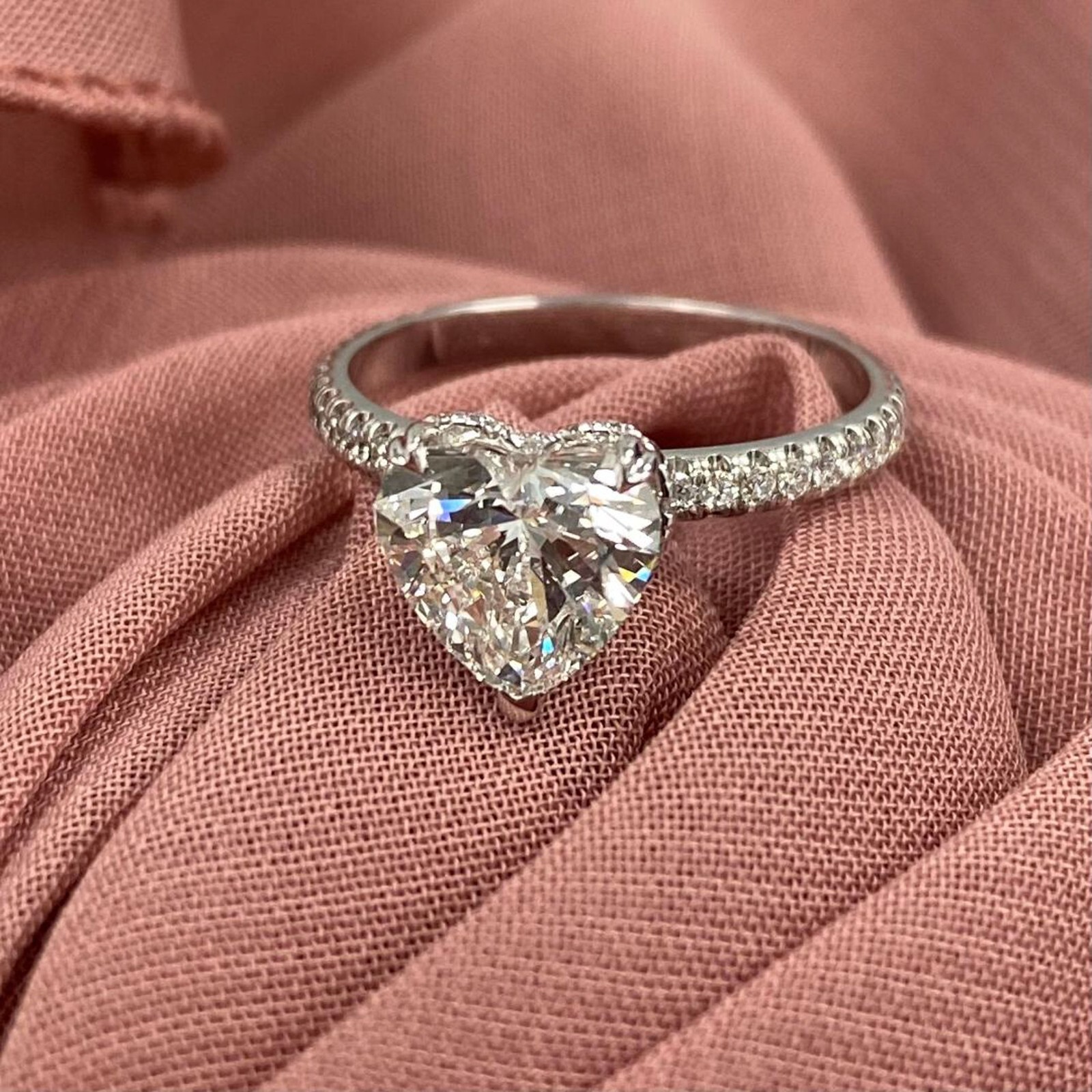 Das 1,59-Karat-Herz-Labor-Labor-Diamant wird fachmannisch geschnitten, um seine Brillanz und sparkle zu maximieren, und sitzt stolz auf einer Gruppe glanzender 14K-Weißgold. Das versteckte Halo-Design umgibt den herzformigen Diamanten mit einer atemberaubenden Reihe von zusatzlichen, brillanten, geschnittenen Labor-Diamanten und fügt noch mehr sparkle und Glanz hinzu.