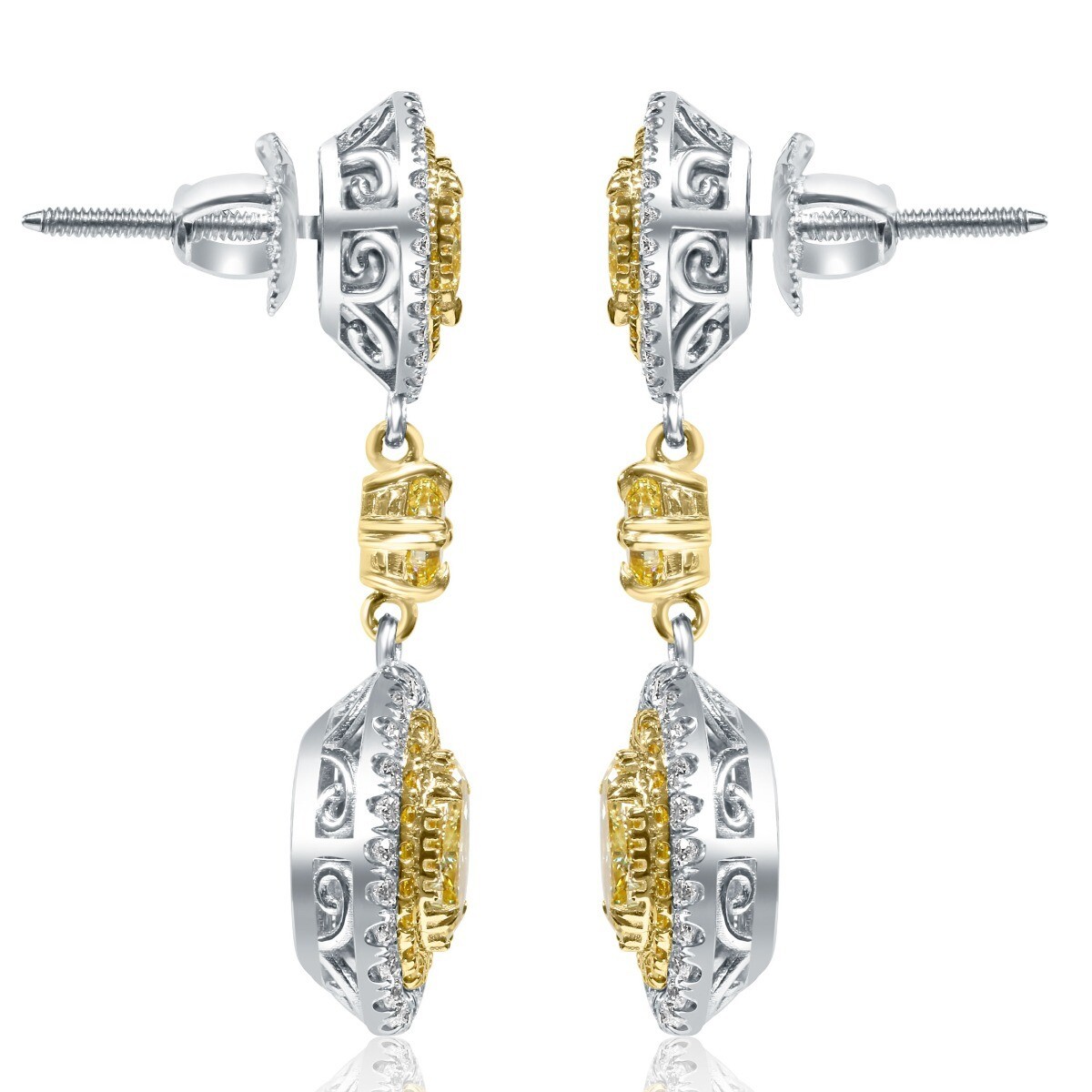 ¡Estos encantadores pendientes de moda agregaran magia a ese momento especial! Estos pendientes de caída colgante cuentan con piedras centrales de diamantes amarillos ovalo de 1,02 ct de diamantes amarillas rodeadas por un halo doble de diamantes de corte redondos incoloros y amarillos en micro pavimento con diamantes amarillos naturales de cojín y cortes de pera. Hecho a mano en oro de dos tonos de 18k. El peso total de quilates es de 2.95 quilates. Los pendientes se aseguran con el cierre del tornillo.