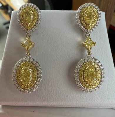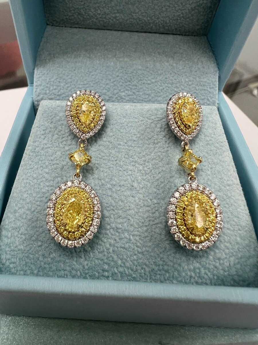 ¡Estos encantadores pendientes de moda agregaran magia a ese momento especial! Estos pendientes de caída colgante cuentan con piedras centrales de diamantes amarillos ovalo de 1,02 ct de diamantes amarillas rodeadas por un halo doble de diamantes de corte redondos incoloros y amarillos en micro pavimento con diamantes amarillos naturales de cojín y cortes de pera. Hecho a mano en oro de dos tonos de 18k. El peso total de quilates es de 2.95 quilates. Los pendientes se aseguran con el cierre del tornillo. Todos nuestros productos estan hechos a mano con calidad y cuidado, en el corazon del Distrito de Diamantes en la calle 47 en la ciudad de Nueva York. Nuestra dedicacion y compromiso con el buen trabajo y la calidad excede a todos los demas. Dado que todos nuestros productos estan hechos a