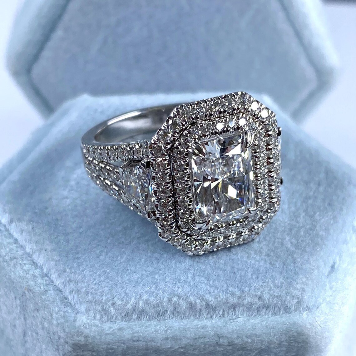 Dieser atemberaubende Verlobungsring bietet in seiner Mitte einen herrlichen Diamanten von 2,06 Karat-Radiant-Cut-Labor. Um den Mittelstein ist ein doppeltes Halo des runden Schnitts und auf den Seitenbillionen Labor, die Diamanten angebaut haben, was dem Ring einen Hauch von Glamour und Romantik verleiht !! In 14.000 Weißgold gefertigt. Das Gesamtkarat -Gewicht betragt 4,02 Karat.